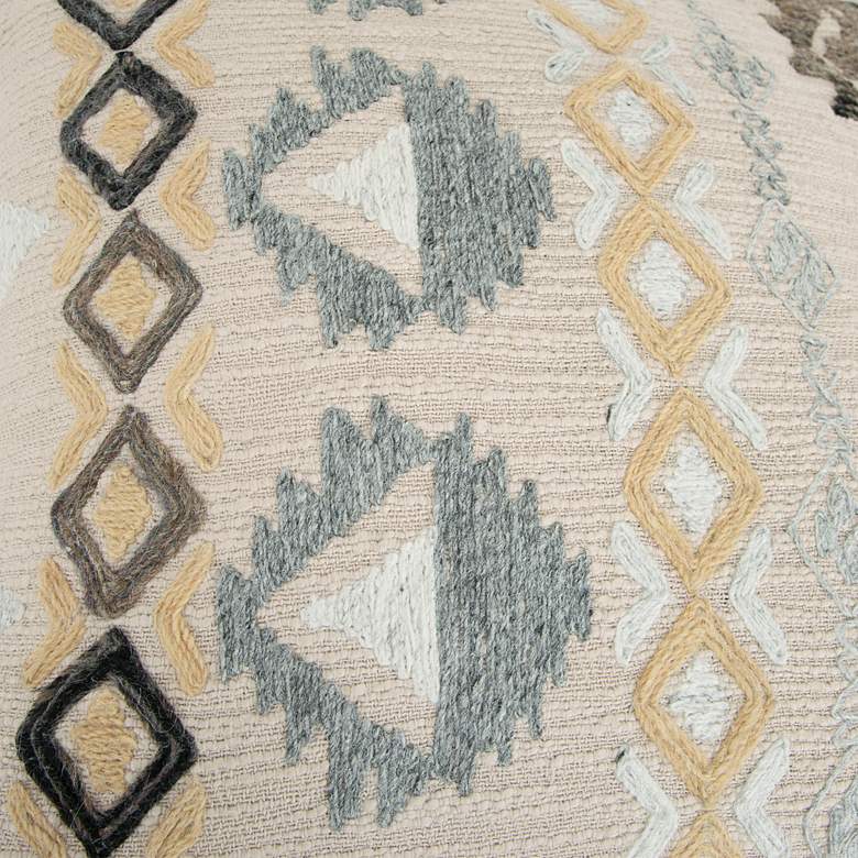 Tribal charm flatters this traditional Southwest square throw pillow with a pleasing repeating print series in neutral tones. Grays and browns in various shades create a visual enticement over cotton with a beige solid cotton back. Poly fill ensures plump shaping to this knife-edged pillow. Made in India.