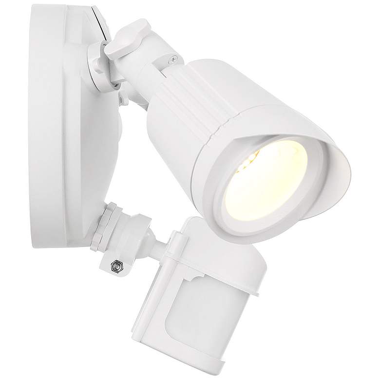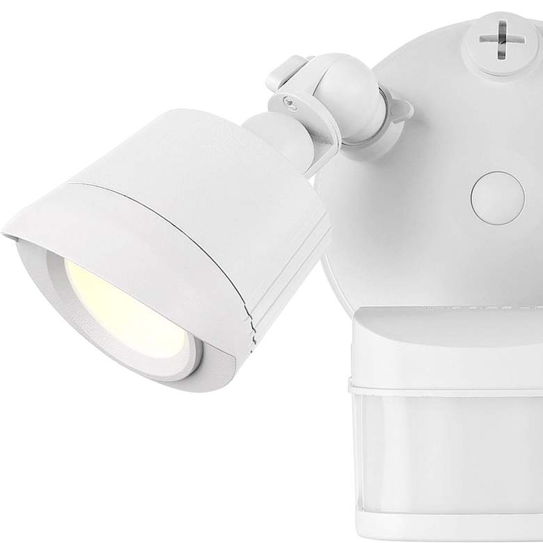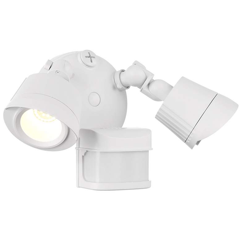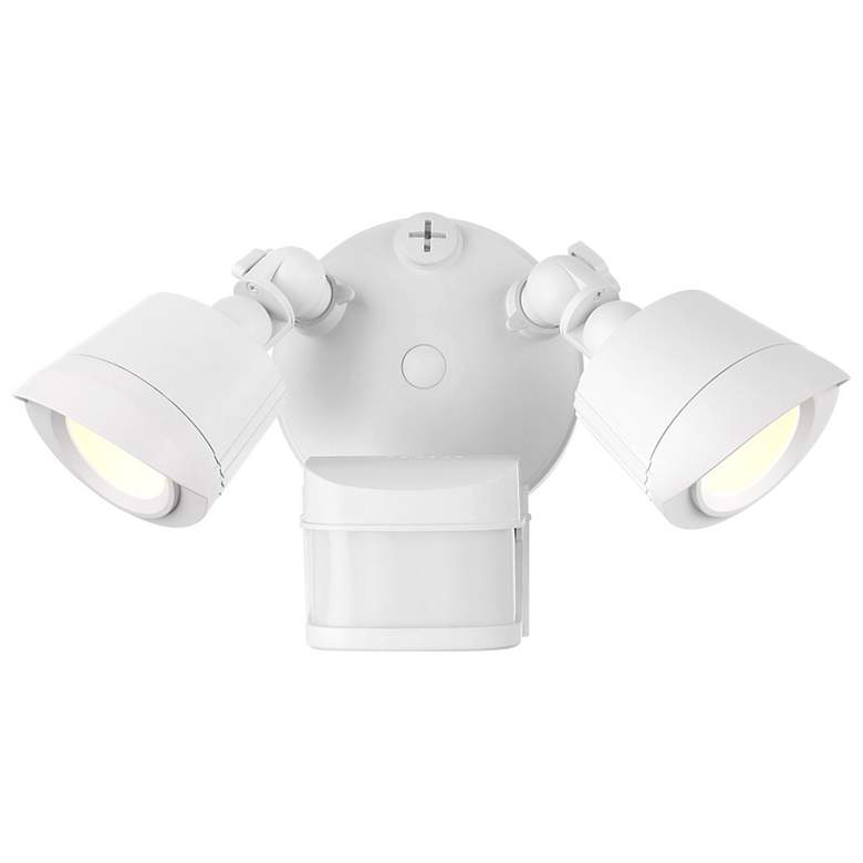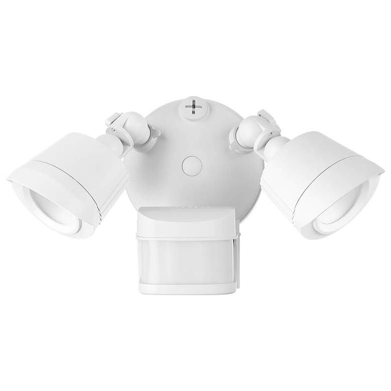 The modern double head outdoor flood light, designed by Savoy House, updates your home's exterior aesthetic while providing ample flood light. The white finish over aluminum frame brings a sleek, updated aura while making it a versatile lighting element for various decors. A glass diffuser helps create clean, bright light. This fixture's motion sensor covers 270 degrees, delivering a reliably effective illumination over a wide area.