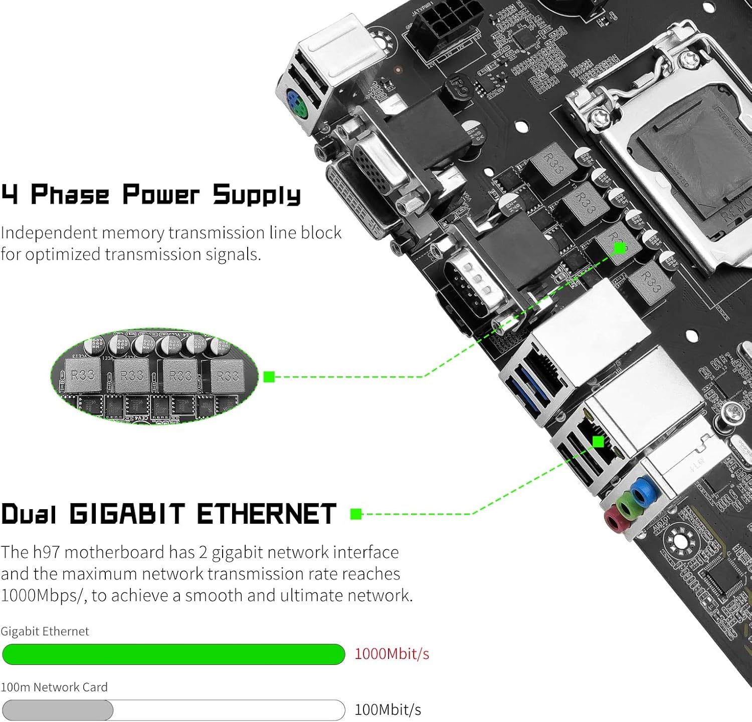 - High Performance Mainboard: The lga 1150 DDR3 motherboard is equipped with H97 chipset. And with Heat dissipation armor protection for strong heat dissipation, to ensure stable bus communication