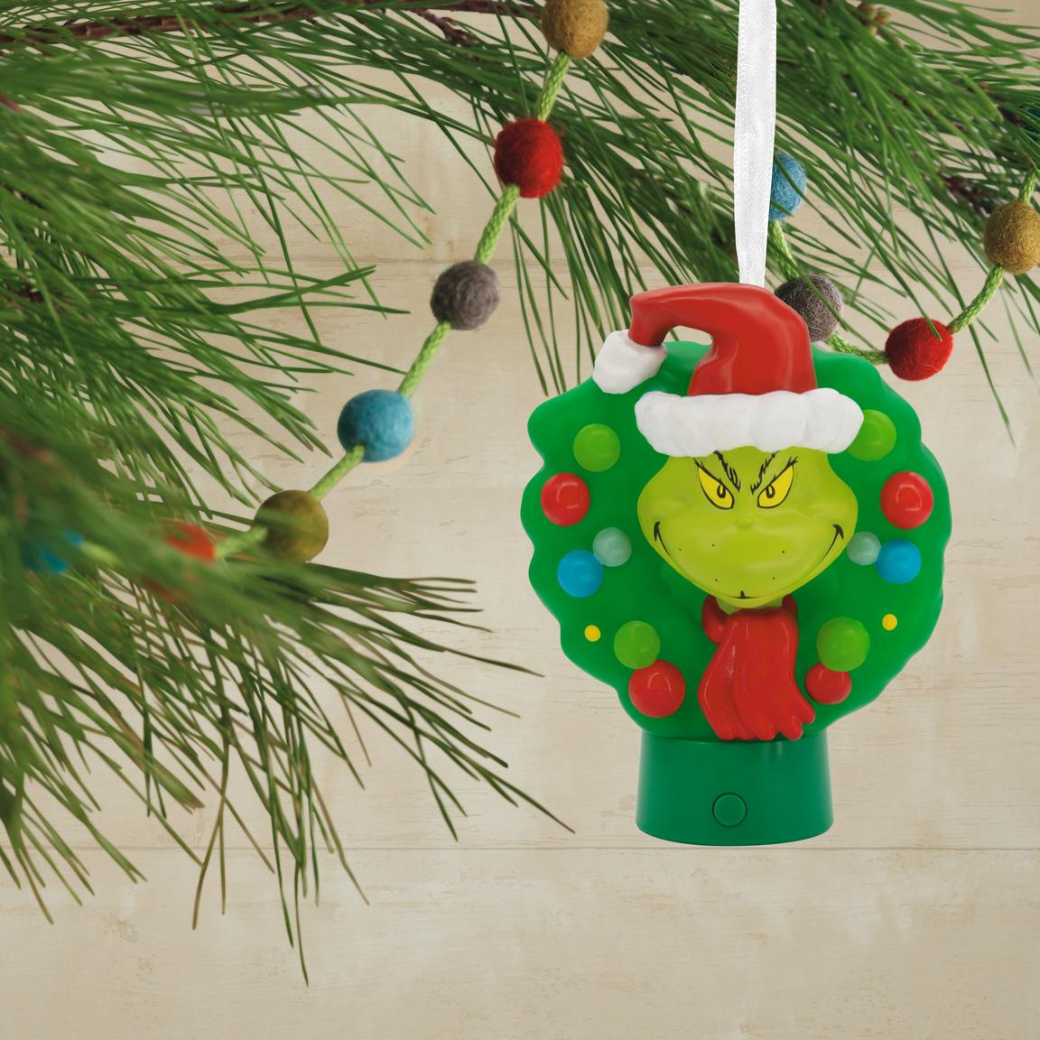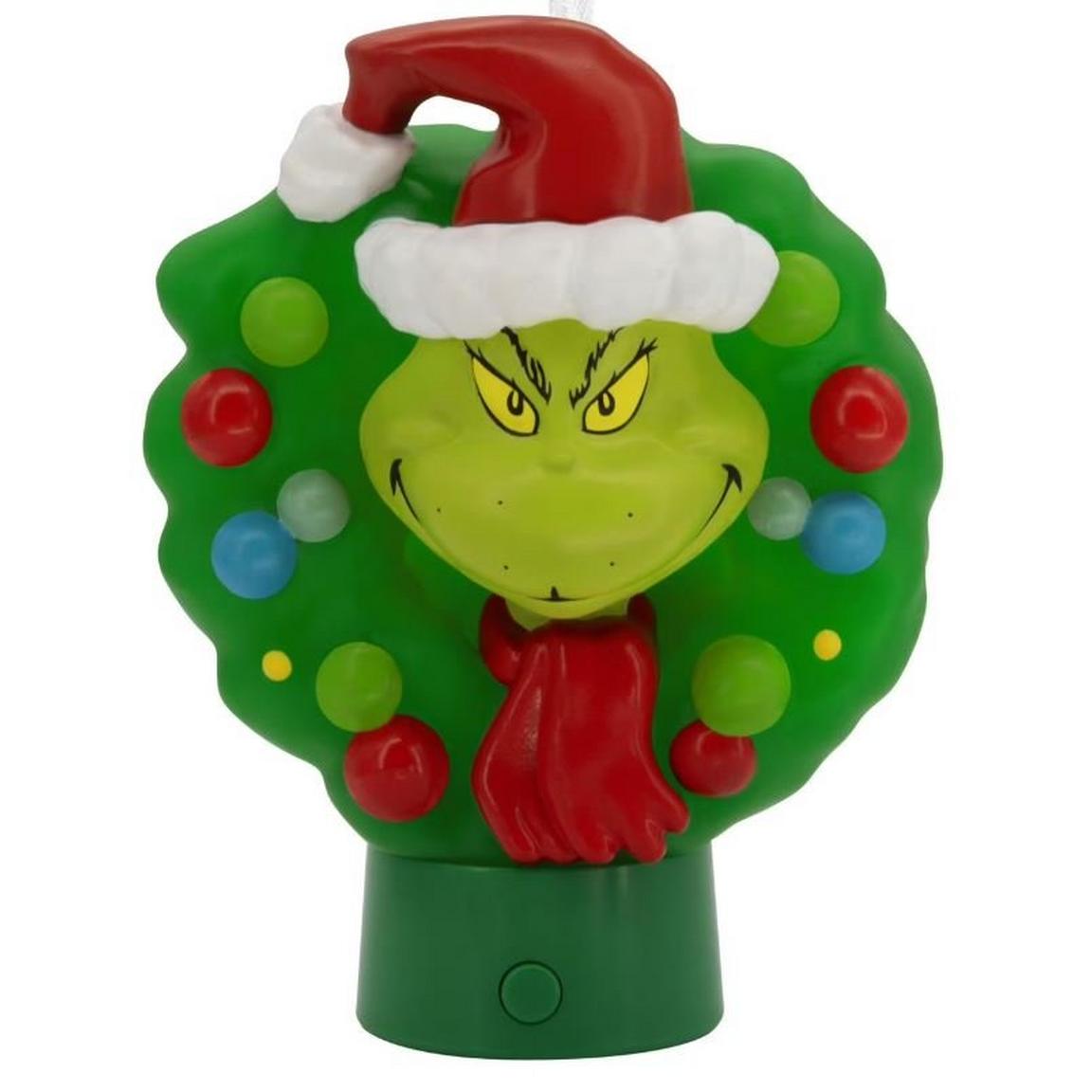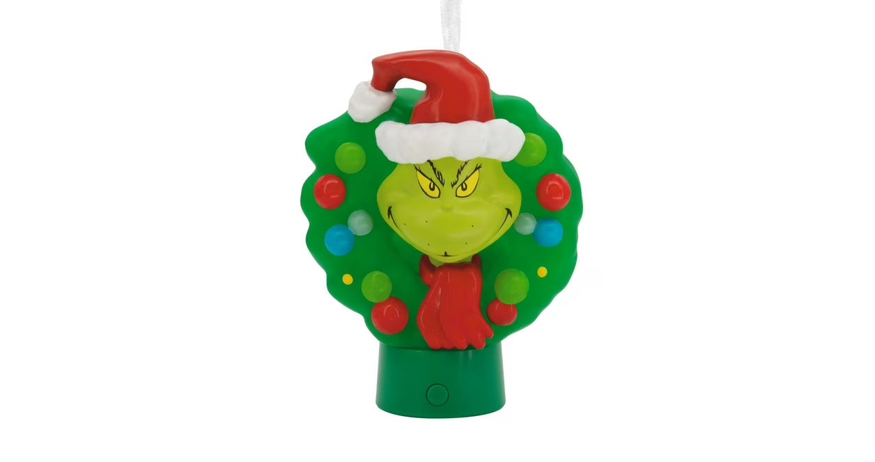 - This light-up ornament features the Grinch in a Santa hat and a cheerful wreath.