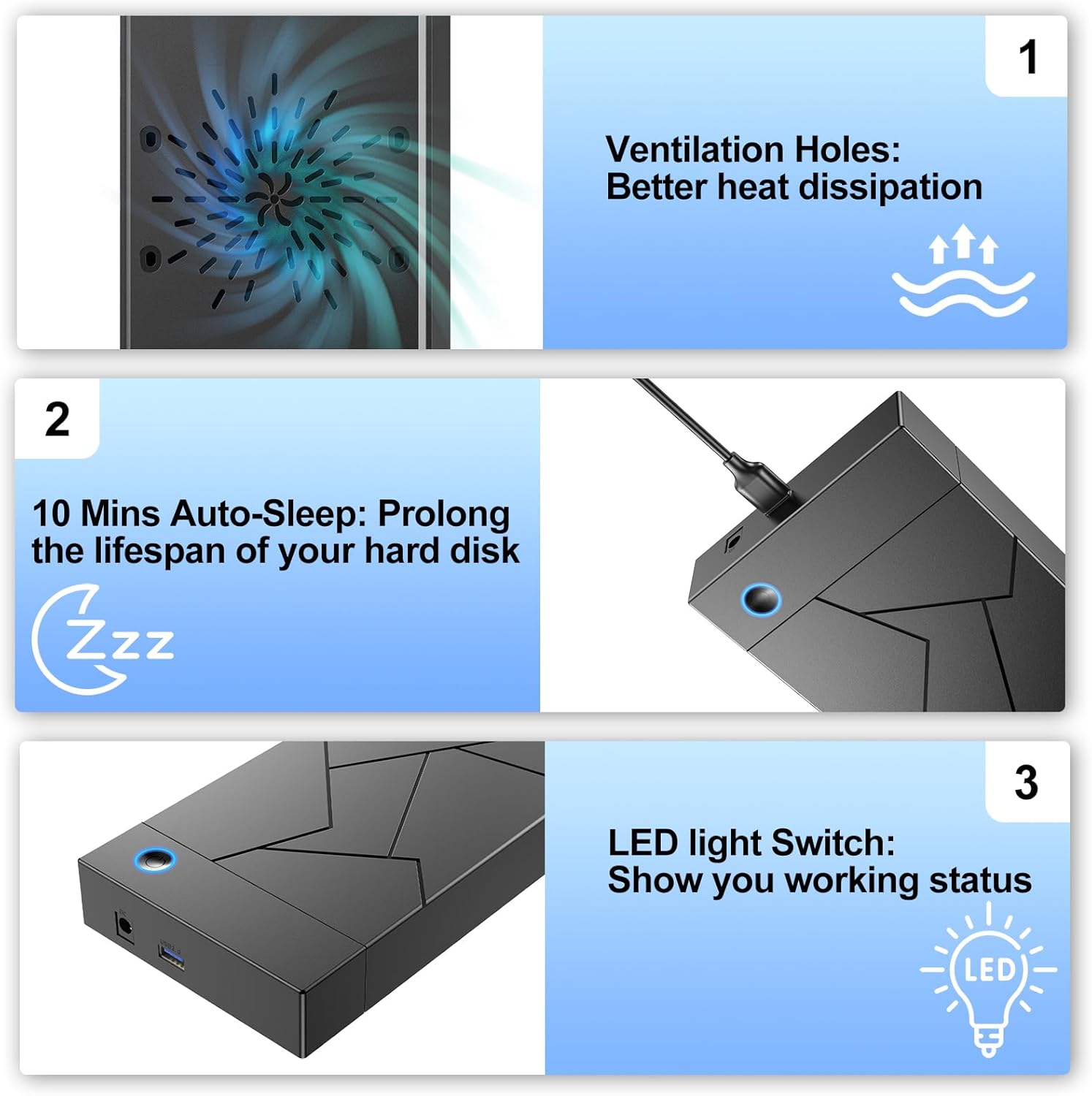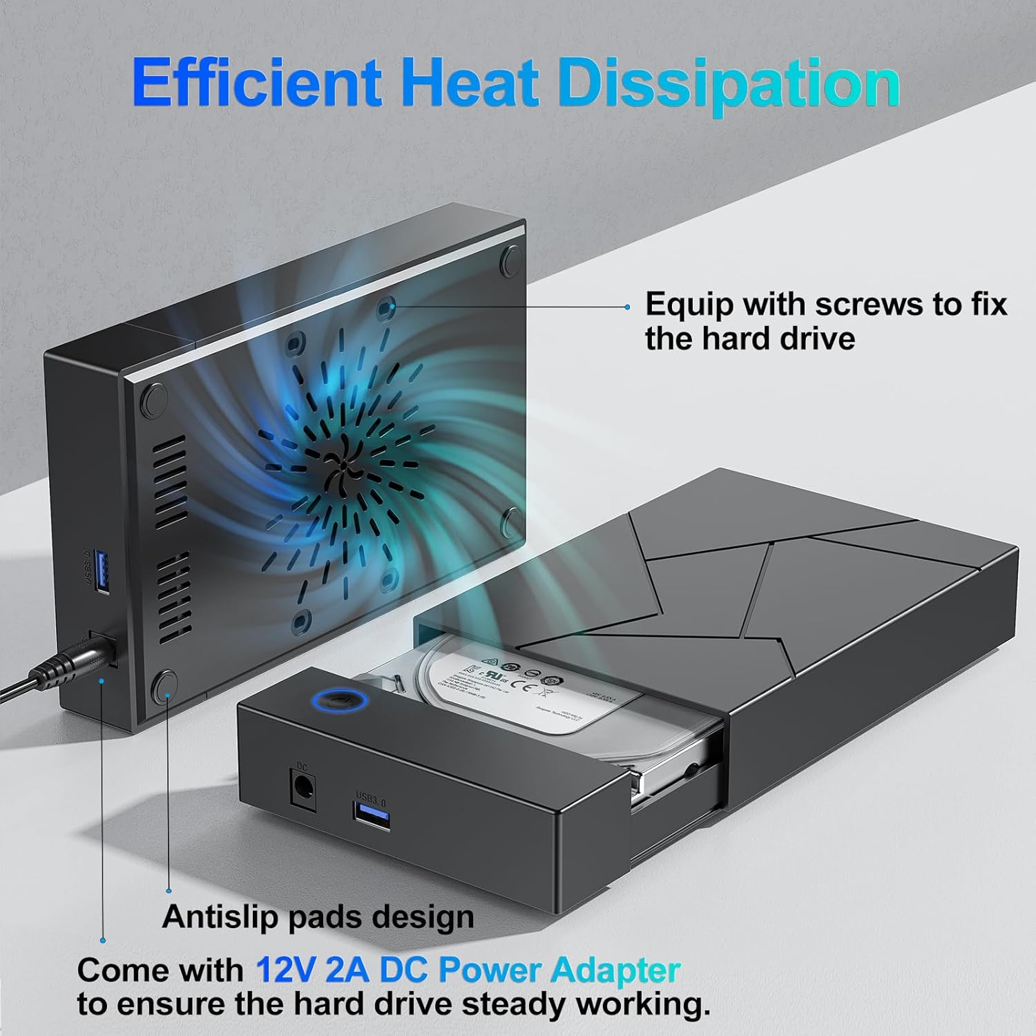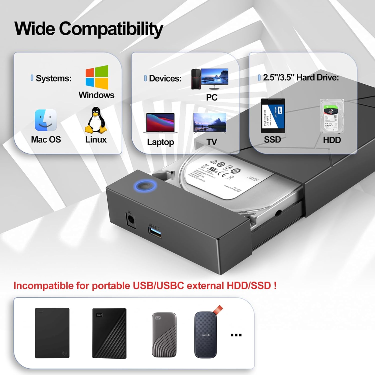 - 【Wide Compatibility】The hard drive case is specifically designed for 3.5"/2.5" SATA III/II/I HDD SSD up to 20TB. Compatible with WD, Seagate, Toshiba, Hitachi, Samsung, Crucial, SSD and HDD with SATA ports. The USB 3.0 interface is compatible with Windows 10/8/7, XP, Vista, Mac OS 9/10/11, ChromeOS, Linux and other computer systems, equipped with desktop computers, laptops, tablets and other USB A devices.