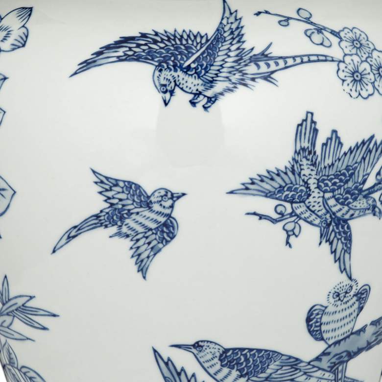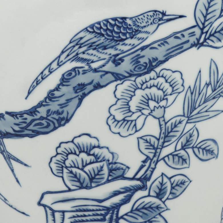 - Blue bird, flower and vine patterns on white background. Glossy finish. Ceramic construction.