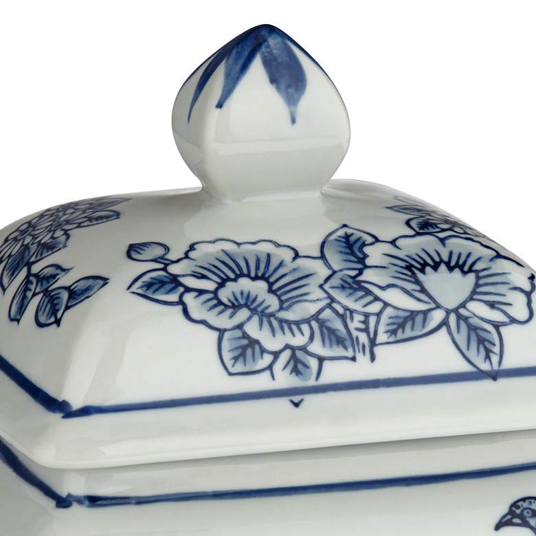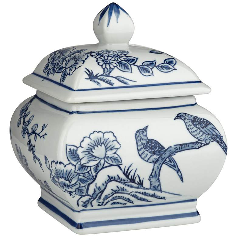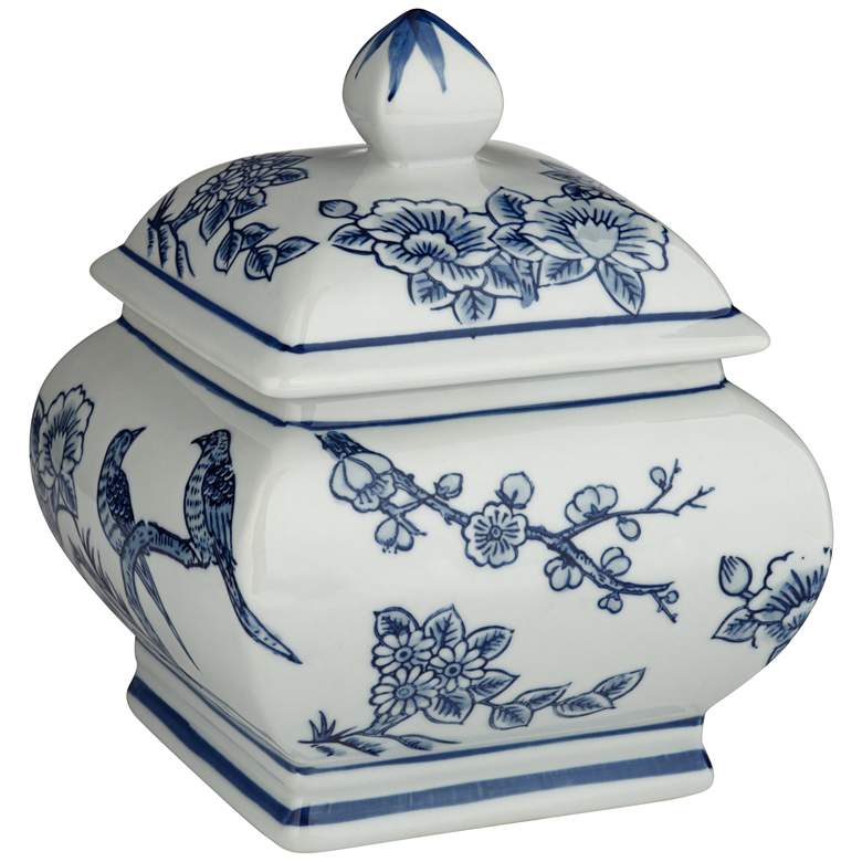 Embrace the traditional beauty of a ceramic decorative jar created to captivate. White ceramic construction receives a decadent glossy finish as this hand-painted jar reflects a classic blue bird, flower, and vine pattern. Shapely silhouetting stands out in a water-safe jar. This vase may be used indoors or outdoors.