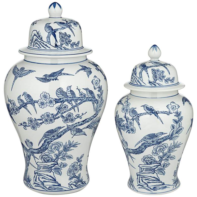 Add a decorative touch to your sideboard or countertop with this set of two traditional ceramic ginger jars with lids. From the Heather collection by Dahlia Studios, these charming decorative jars feature an Asian-inspired painted motif of birds, flowers, and vines, all done in classic blue on white. The jars feature a curvy silhouette and are complete with a lid. They are watertight, but not suitable for food use as they contain lead.