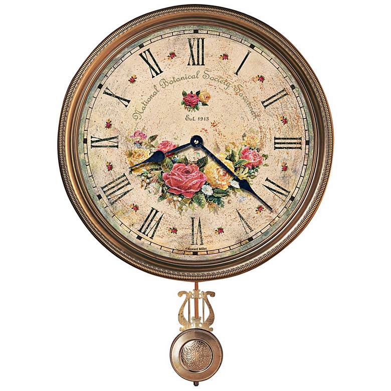 This brass wall clock from Howard Miller takes you back in time with its antique Moment in Time dial - derived from some of Howard Miller's earliest clock designs. Antique brass finish bezel and decorative pendulum highlight the botanical face design and give this clock a beautiful patina.