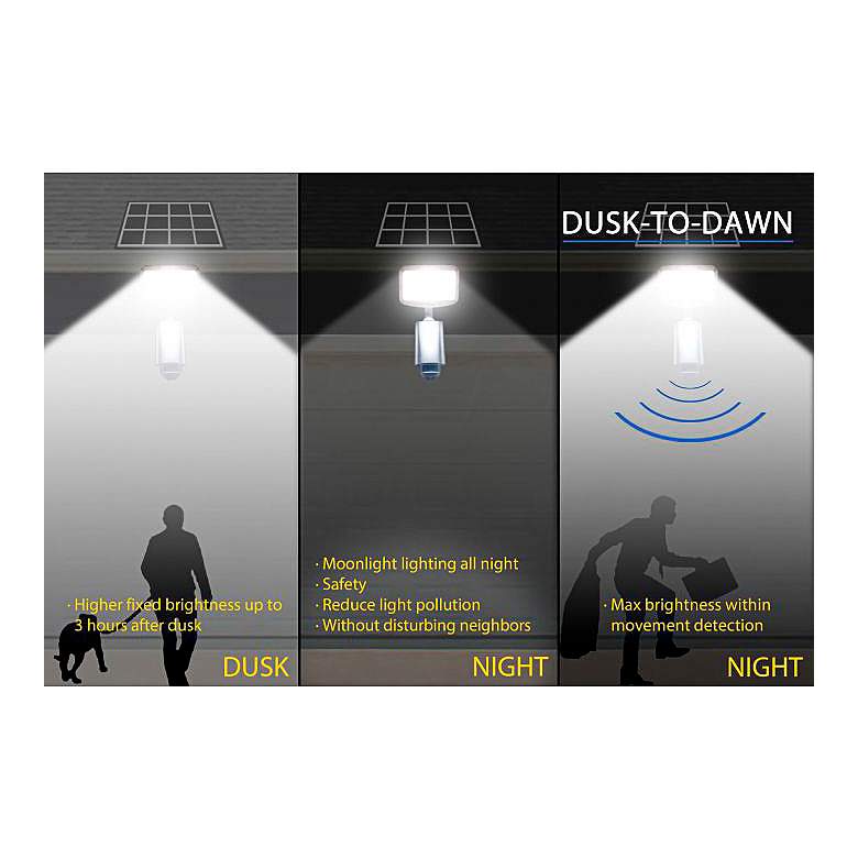 Modern technology improves light delivery with a modern solar hybrid LED flood spotlight featuring AI-SMART to minimize manual settings. This white finish light offers two settings for varying usage and is energy-efficient. A tempered glass solar panel provides peak maximum brightness for use as a security device and another setting for basic illumination from dusk to dawn. Intelligent Power Management (IPM) preserves battery life.