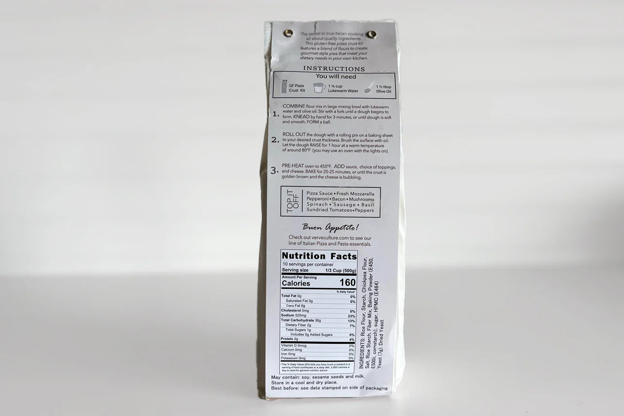 Rice Flour, Starch, Chickpea Flour, Salt, Rice Starch, Fiber Mix, Baking Powder, Sugar. Dried Yeast.