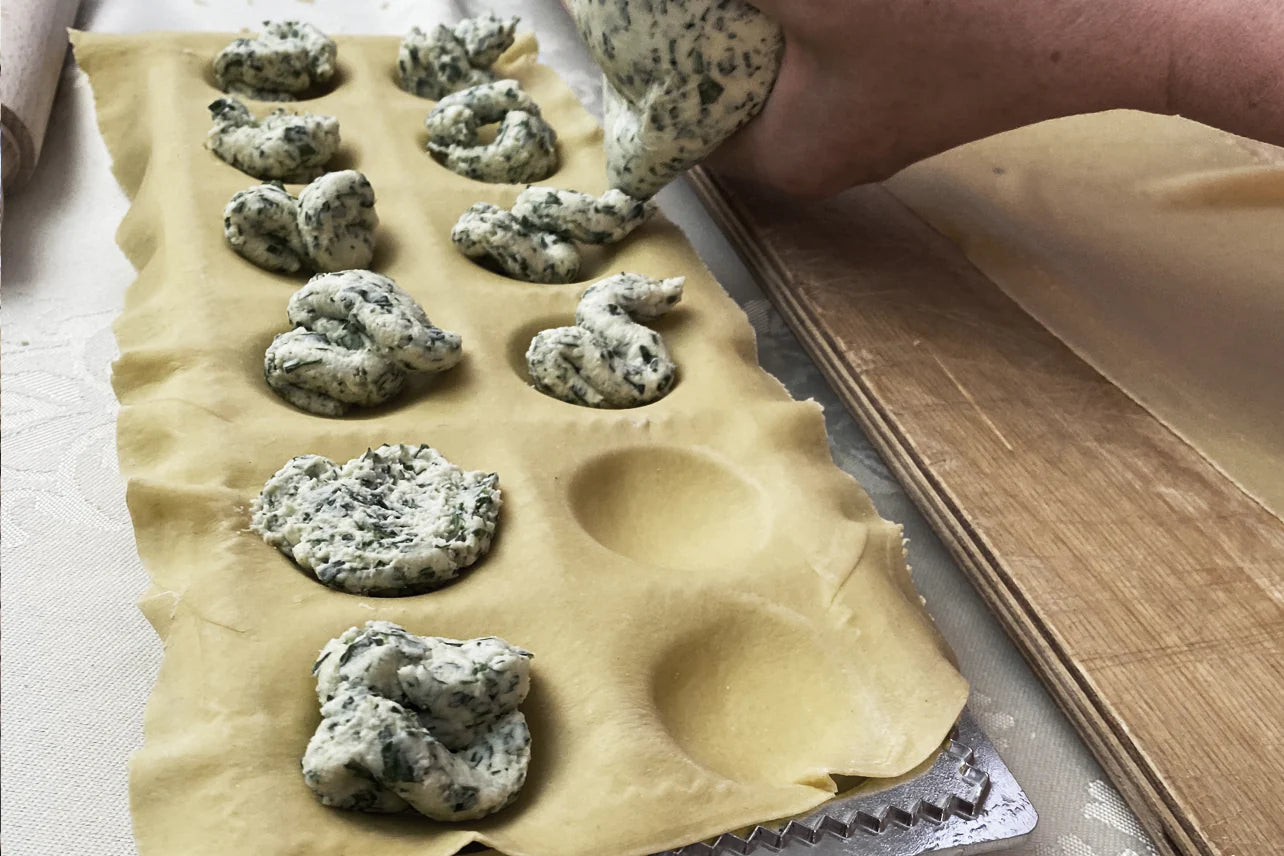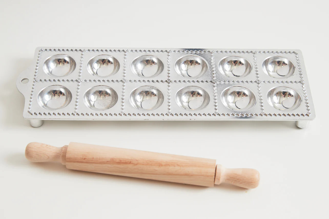 Place a sheet of pasta over the mold, press a filling into each cavity and layer a secondary pasta sheet on top. Run the rolling pin across the mold to cut and seal each form. This mold is constructed of aluminum and the rolling pin is made of beechwood. The rubber feet on each corner help prevent slipping during use. The kit is packaged in a giftable muslin bag.