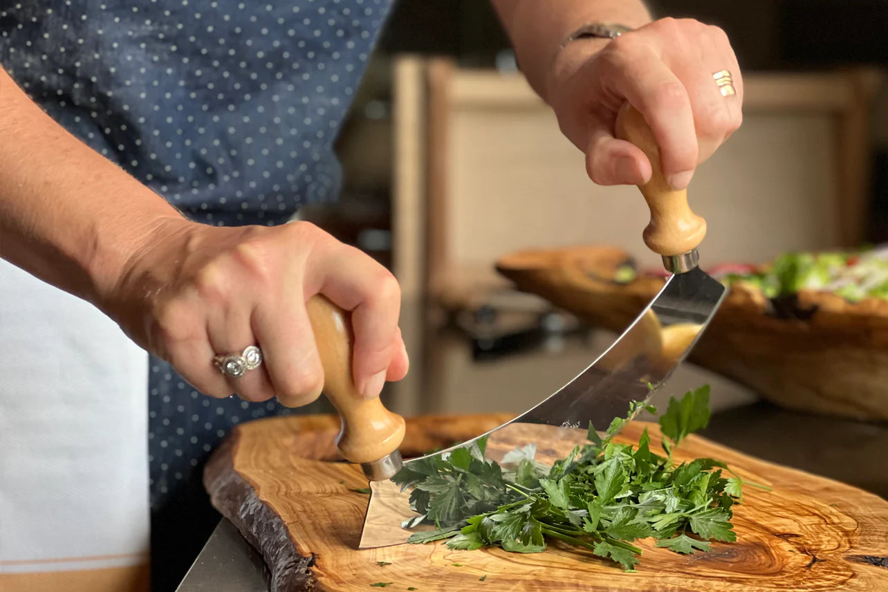 A traditional tool, the Mezzaluna, (meaning “half-moon” in Italian) is a culinary favorite when it comes to quick, efficient chopping. This crescent shaped knife is the perfect companion for every culinary enthusiast and professional chef, making chopping and mincing a breeze. Strong beechwood handles make it easy to grip while keeping hands away from the blades. The finely honed edge effortlessly glides through herbs, vegetables, and even nuts, saving you time and effort in the kitchen.