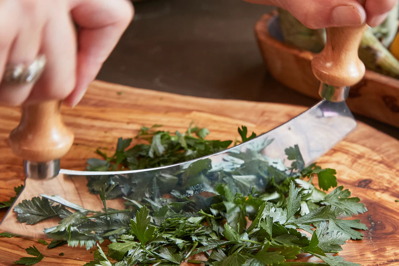 The Mezzaluna chops with a rocking motion, unlike traditional knives that slice straight down. A food processor’s blade pulverizes its ingredients into an unrecognizable state, whereas the teeter-totter technique of the Mezzaluna gently releases aromatics and oils, rather than turning everything into a combined mulch.