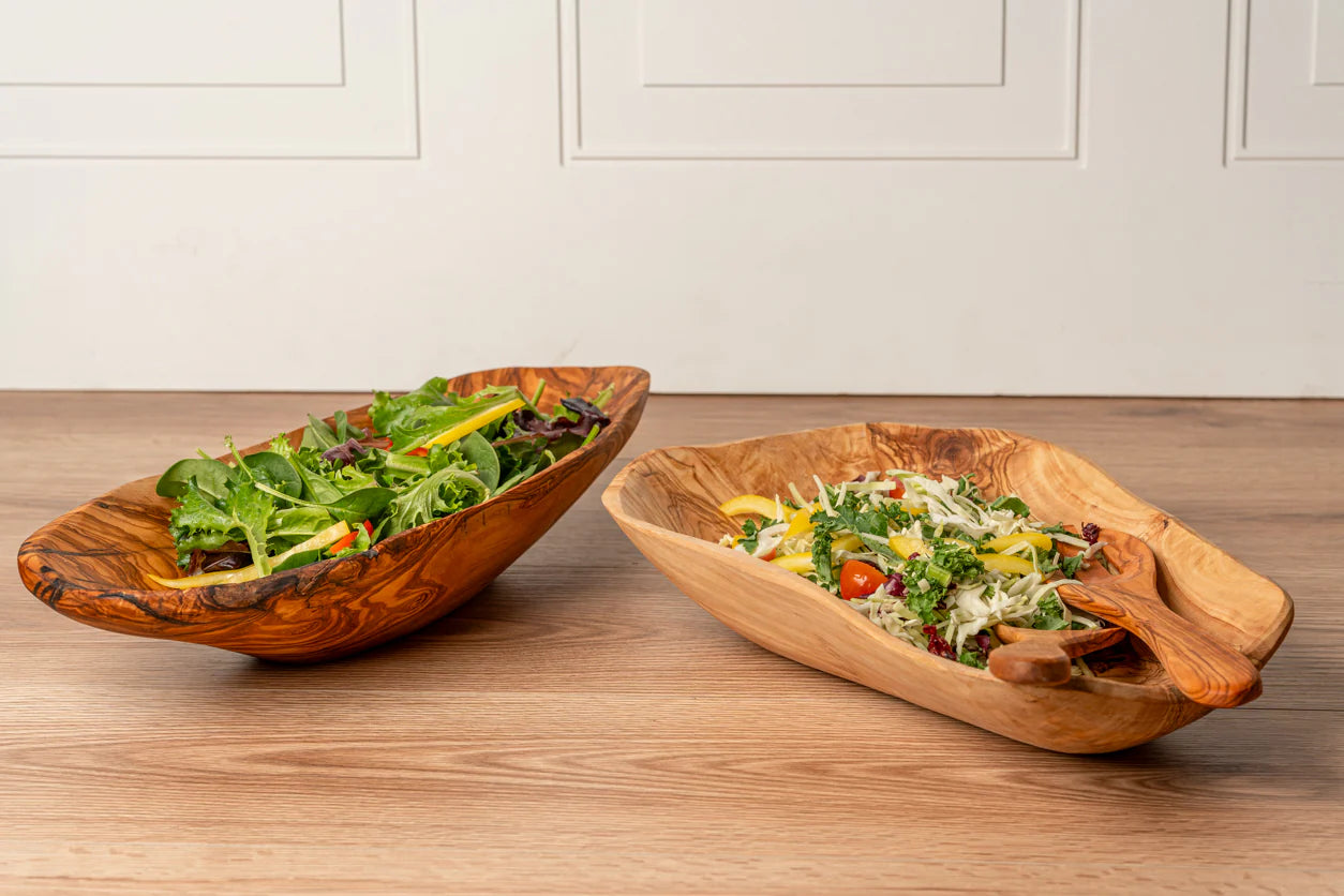With its bold grain and rich color, our stunning Italian Olivewood Salad Bowls make any dish a centerpiece. Perfect for serving everything from tossed greens to pasta salad with style, this artisan-carved bowl showcases the dramatic variations in tone and pattern that olivewood is known for, with a live edge that brings a rustic charm to any dinner table. Natural variations in the wood combines with handmade craftsmanship that results in a truly unique and eye-catching piece. Pairs perfectly with our Italian Olivewood Salad Servers.