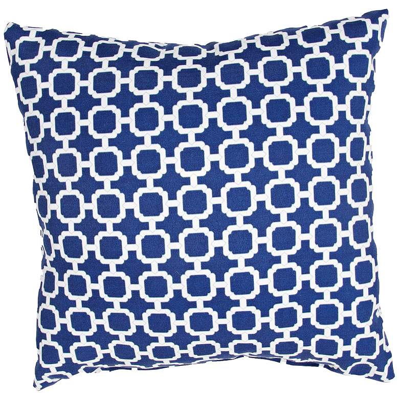 This lively, contemporary, square accent indoor-outdoor pillow is made in the U.S.A. by Jaipur and features a dark twilight blue and bright white interlocking pattern. Dry clean-only polyester fabric with poly fill.