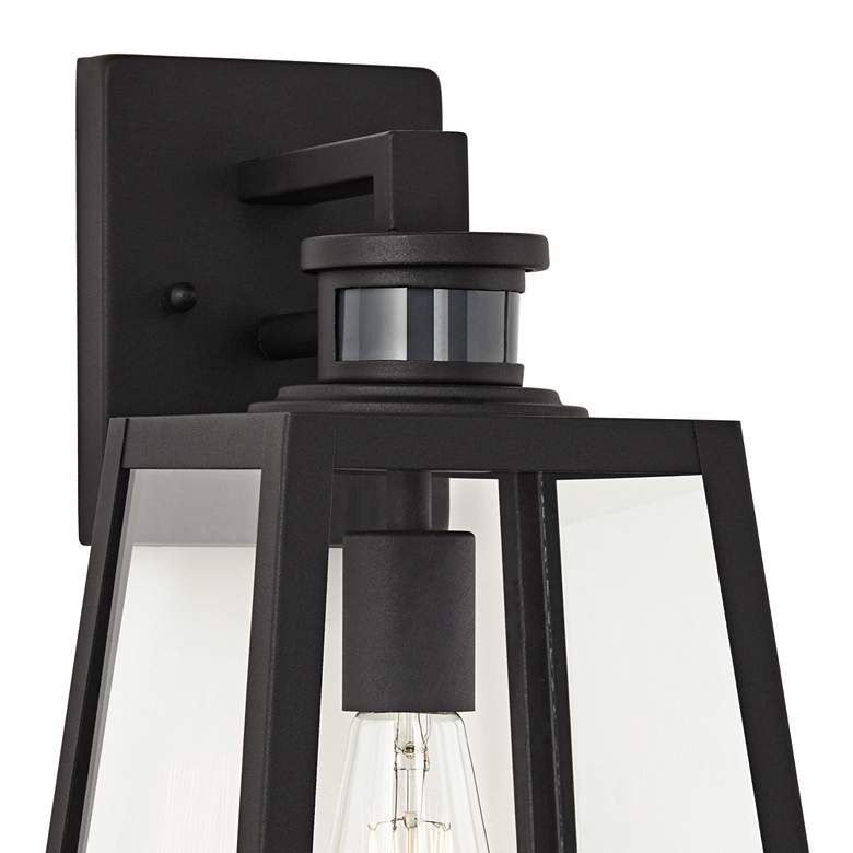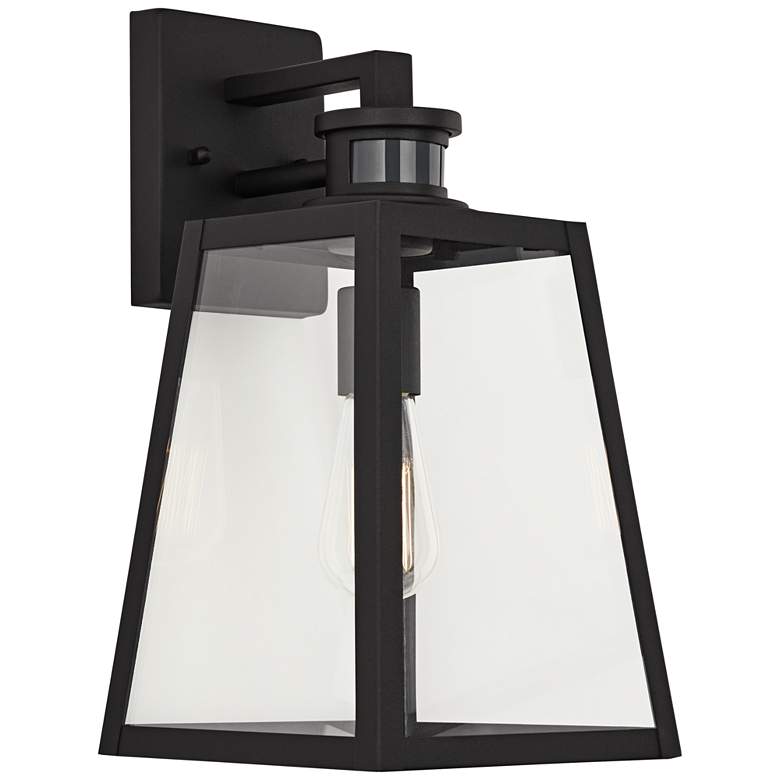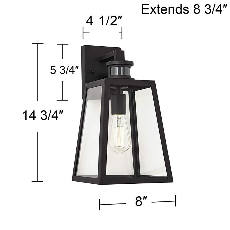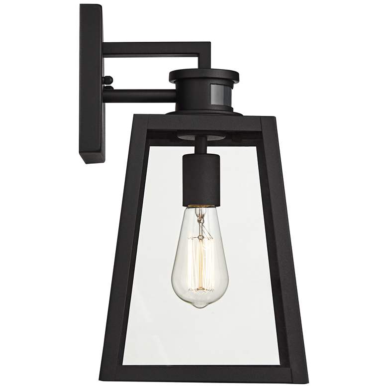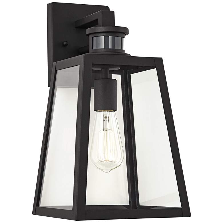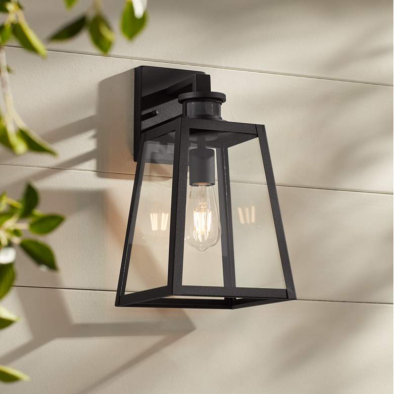 Brighten up your home's exterior with this handsome outdoor wall light from the Arrington collection by John Timberland. This updated industrial design comes in a tapering black frame with a sleek, straight-lined look. Clear glass panels offer a full view of its beautiful vintage Edison style bulb. Use the motion sensor functionality with a dual brightness feature for security and efficient lighting. Dual-bright design means the light turns on at 25% brightness and goes to 100% when motion is detected. Two minutes after motion is no longer detected, the light will revert to low-level brightness.