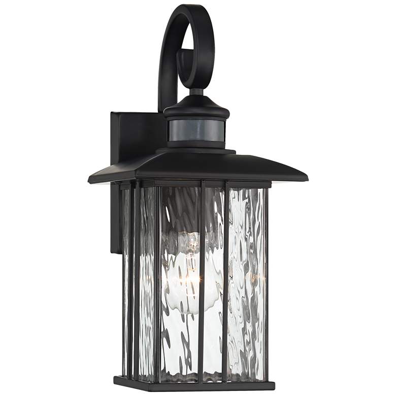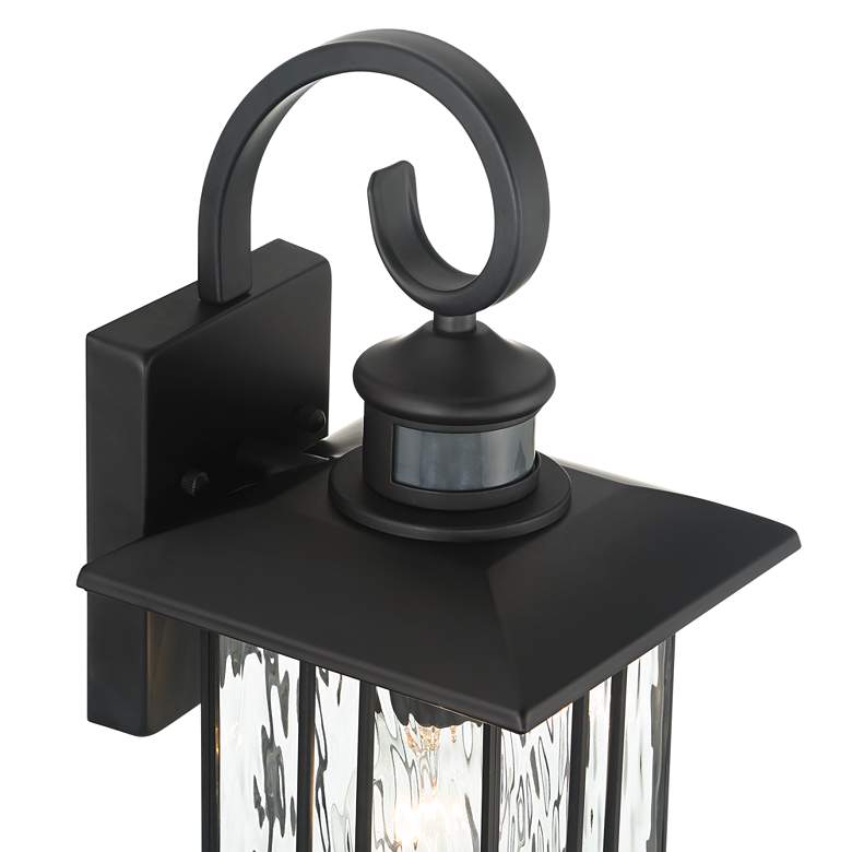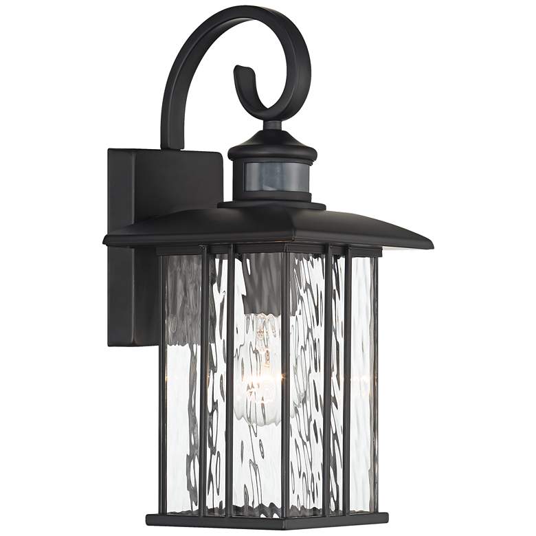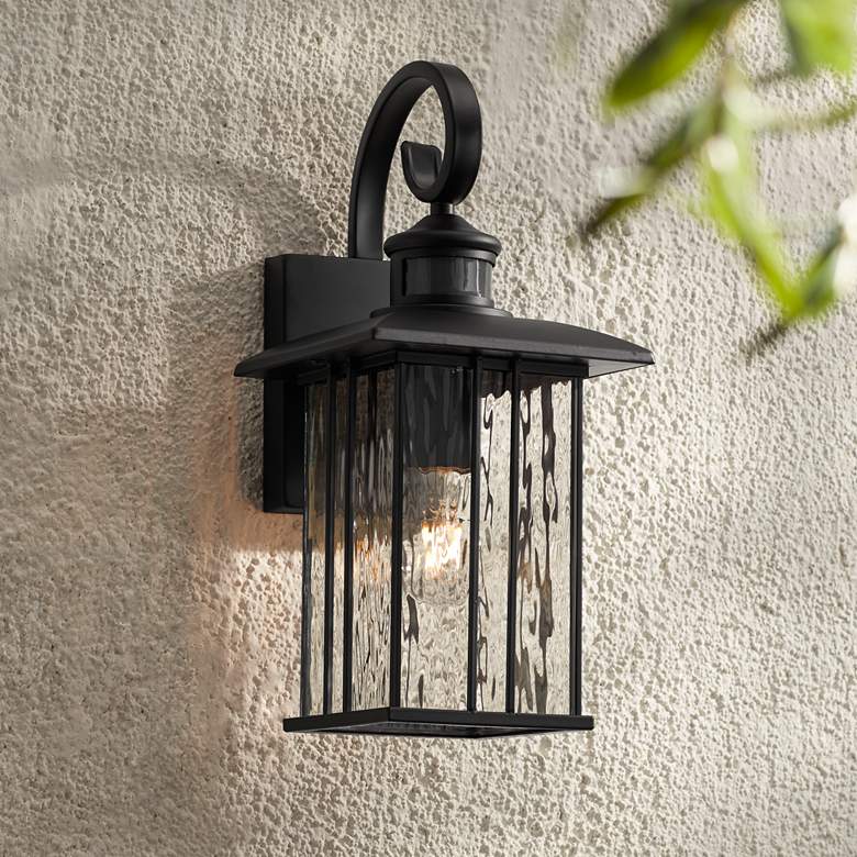 The matte black finish gives this Deaver motion sensor lantern outdoor wall light by John Timberland® a warm and elegant personality. The clear water glass decorates the design with stunning character. With a motion sensor, this light turns on when it recognizes motion nearby, adding an element of safety to your home.