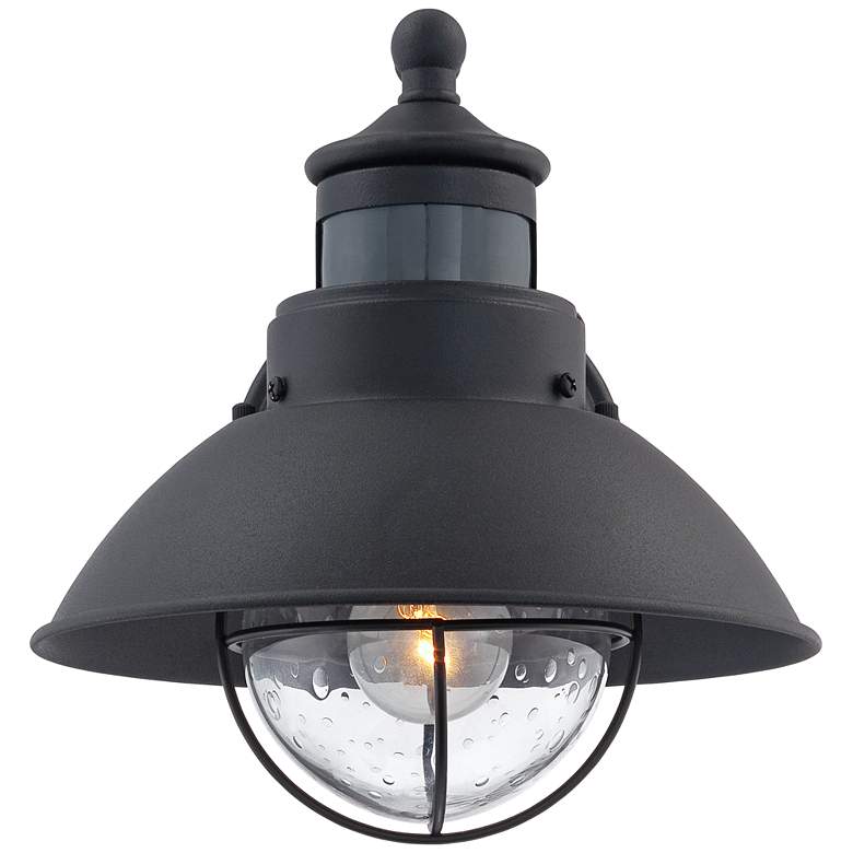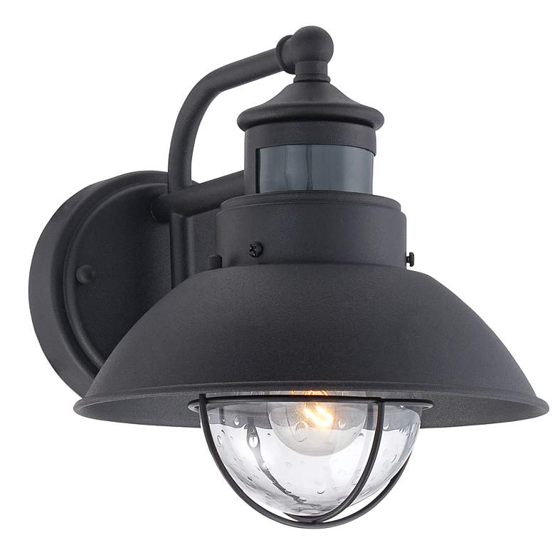 Inspired by classic barn light styles, this outdoor wall light fixture will add a traditional barn light look to your porch or patio. It comes in a handsome black finish over a steel frame, and has a round clear seeded glass shade that protects the bulb. Best of all, this design is outfitted with both a motion sensor and a dusk-to-dawn photocell sensor, giving you an extra sense of security. Dual-bright design means the light turns on at 25% brightness and goes to 100% when motion is detected. Two minutes after motion is no longer detected, the light will revert to low-level brightness.