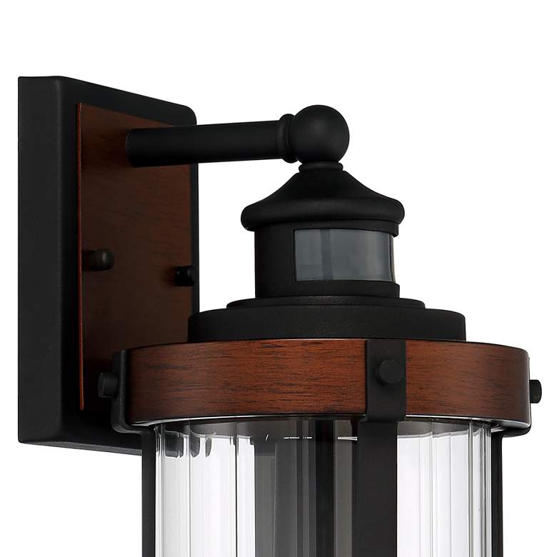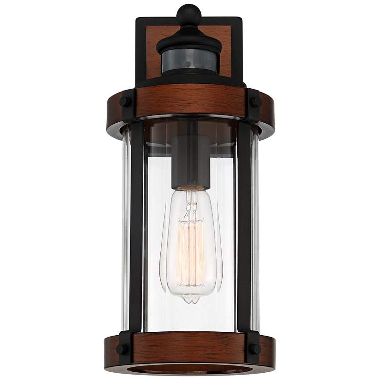 Bring an upscale look to exterior lighting with this chic outdoor wall light from John Timberland lighting. Attention to design detail produces a rich lodge look with industrial flavor. This outdoor wall light features a clear glass shade and a dark wood finish case with black finish metal strips. The design also comes with the Dual Brite two-level lighting feature, which brightens the light output from the light when motion is detected.