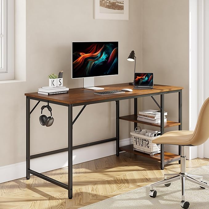 JOISCOPE Home Office Computer Desk with Wooden Storage Shelf, Office Desk and Gaming Table with Splice Board, 2-Tier Industrial Morden Laptop Study Writing Desk, 55 x 24 inches(Vintage Oak)