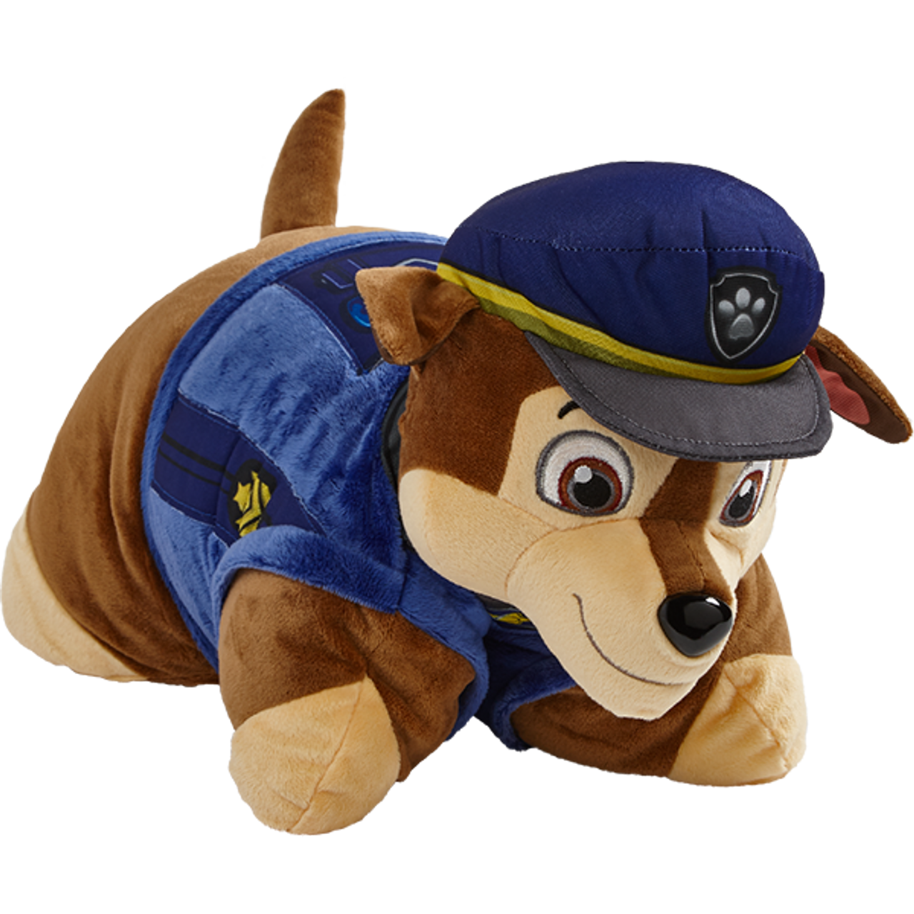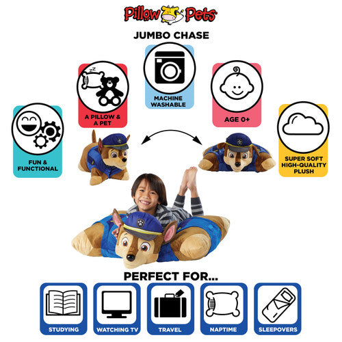 Chase, the adorable German Shepard police pup from Paw Patrol is now super-sized as a Jumboz Pillow Pet. Ready for action, Jumbo Chase adds extra-large fun to imaginative play as a stuffed animal. Unfasten the strap, and this Jumbo Pillow Pet turns into a huge comfy pillow that can be shared with a friend when snuggling, reading or studying.
