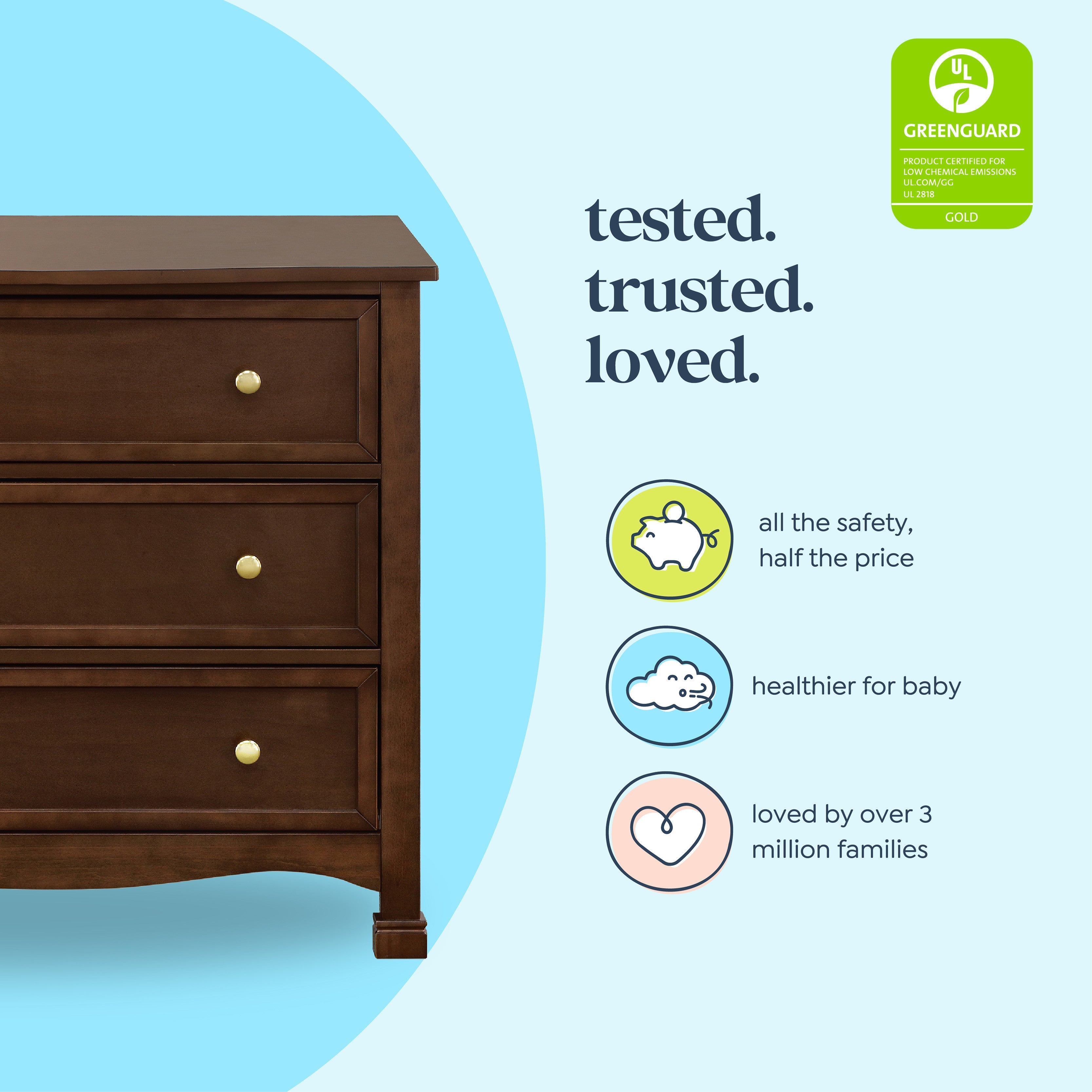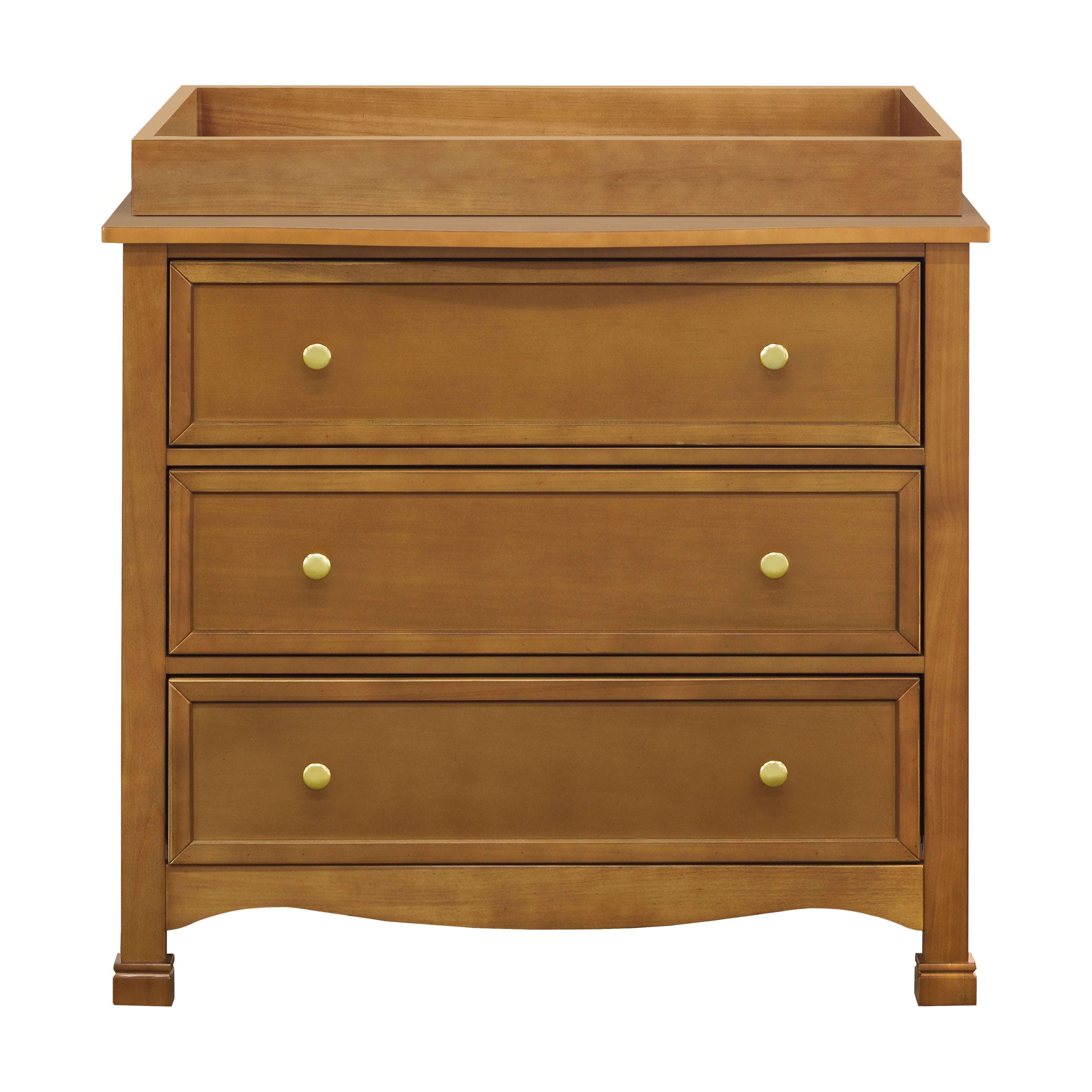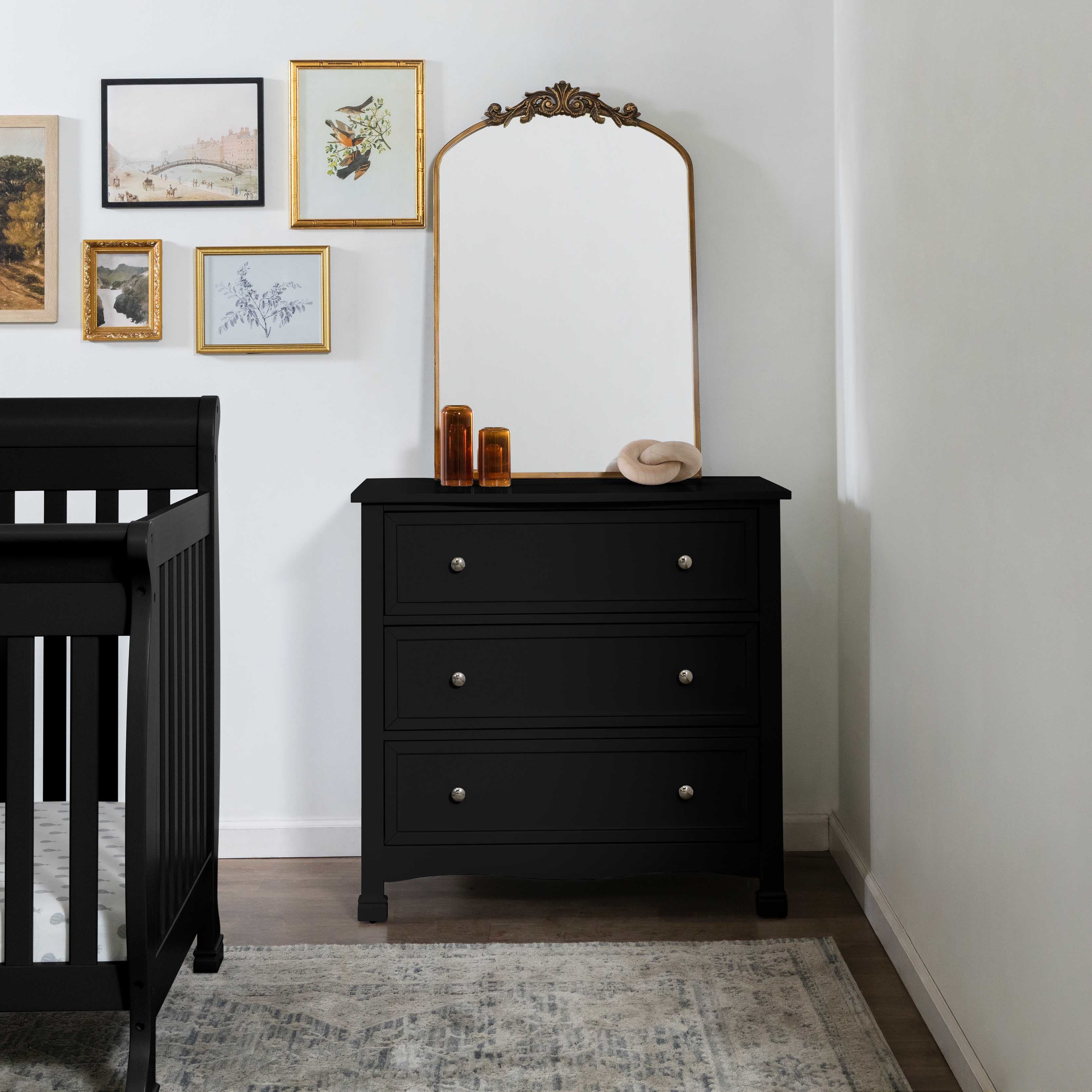 The Kalani 3 Drawer Dresser is the smart changing and storage solution for the classic Kalani collection. Three roomy drawers provide ample storage to simplify organization while thoughtful design ensures a style fit for any nursery. The dresser is detailed with recessed front drawer panels, a gently curved apron front and curved top sides.