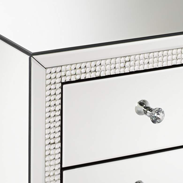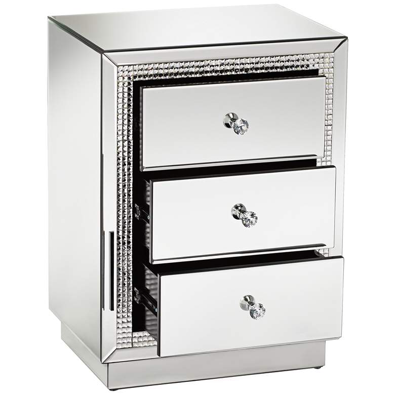 Add a glamorous touch to your living space with this three-drawer end table that's covered in mirror glass panels on the top and sides. Glimmering square beads accent the front frame around the smooth, mirrored drawer fronts. From Studio 55D.