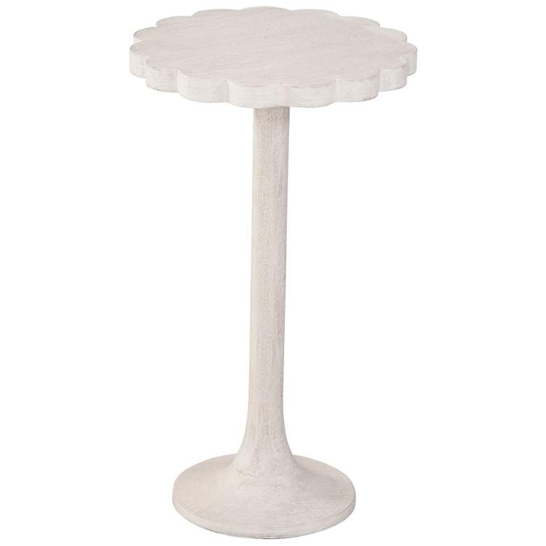 The modern coastal accent table from Basset Mirror Company combines delicate details with streamlined contemporary form. The table features a sandblasted solid mango in a whitewash finish with a scallop top and tulip base design. Place this versatile accent table in a kitchen, dining area or living room to add charm and utility to the space.
