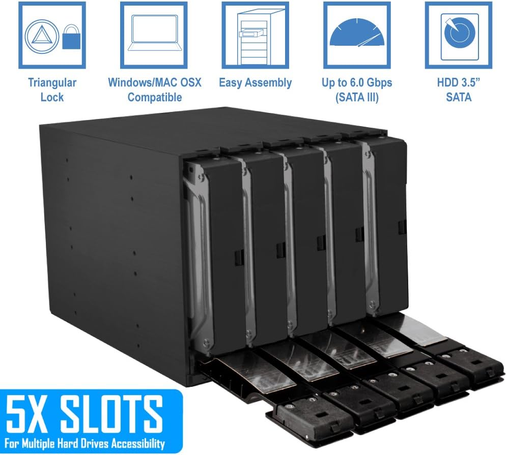- ✔️ 5-Bay Hot Swap Design: Conveniently swap out or add 3.5" HDDs/SSDs. Perfect for data management, backups, and expanding storage.