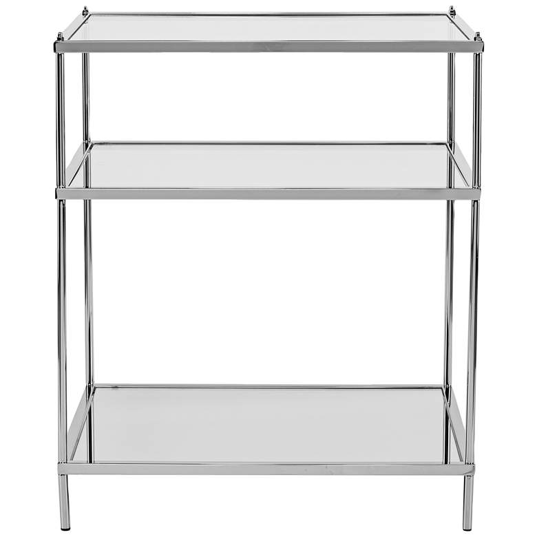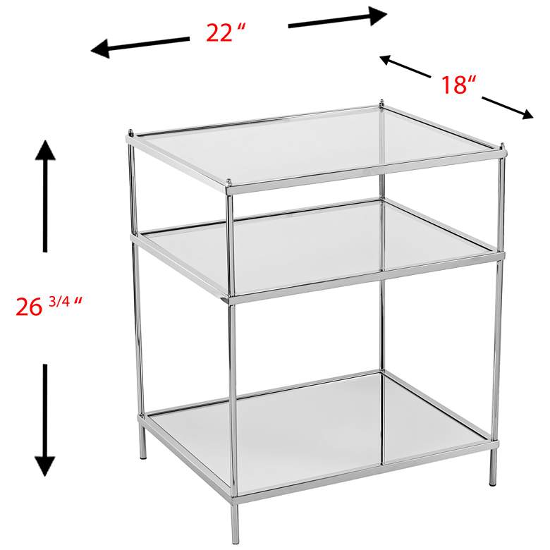 Linear styling complements the delicate look of glass and iron, offering a design-forward concept in this tasteful end table. Three layers create generous space for display, but also look lovely left untouched. This metallic chrome finish iron and glass rectangular side table features a tabletop made from tempered glass and mirrored shelves.