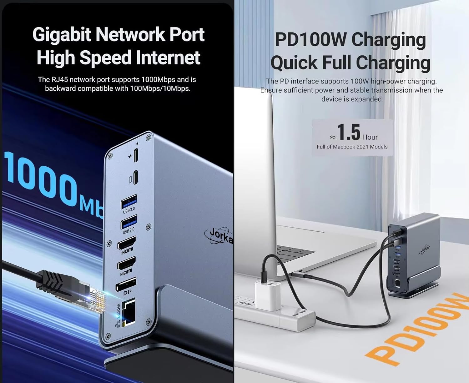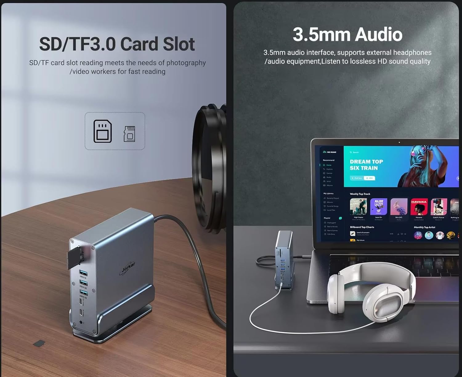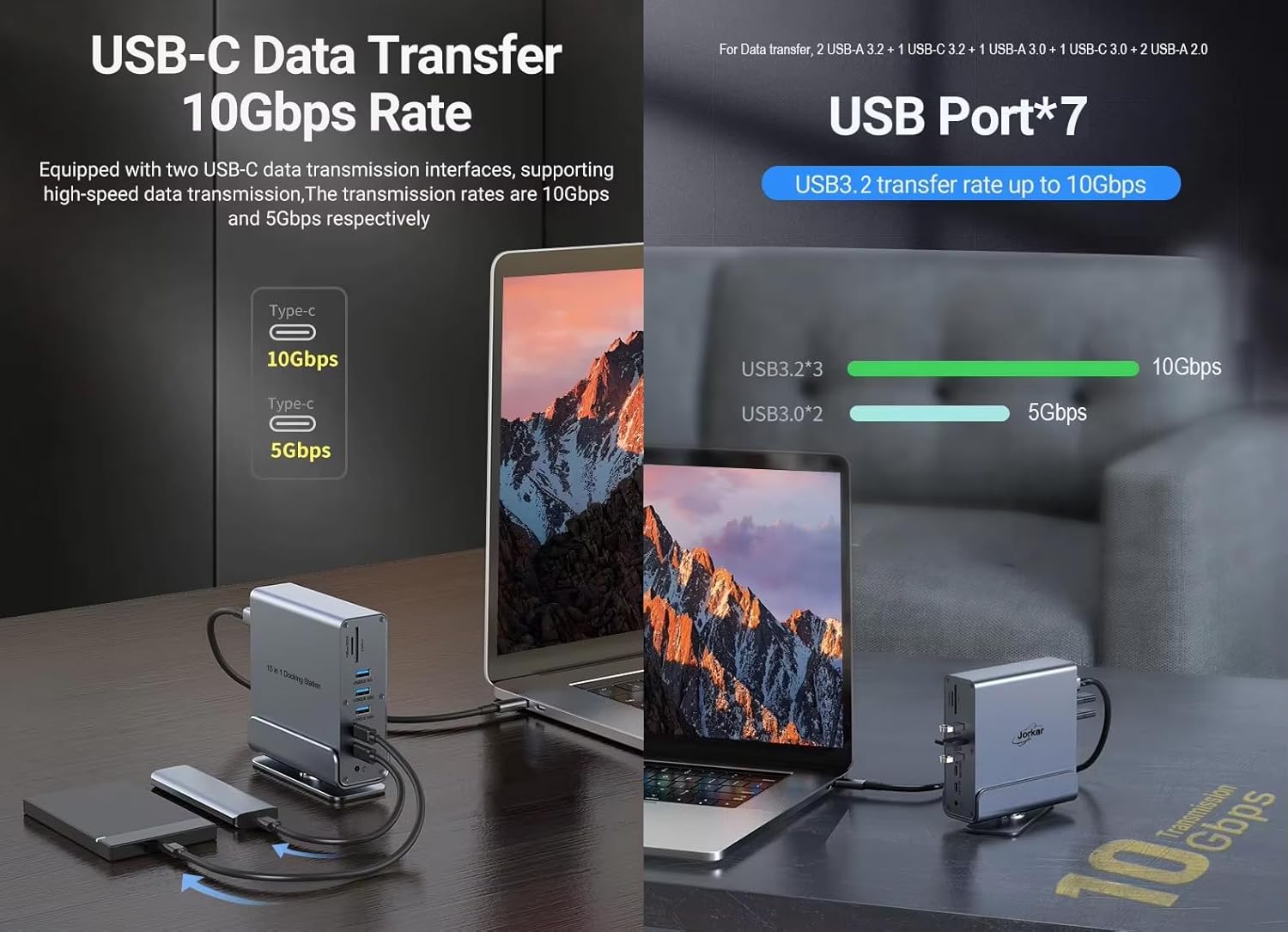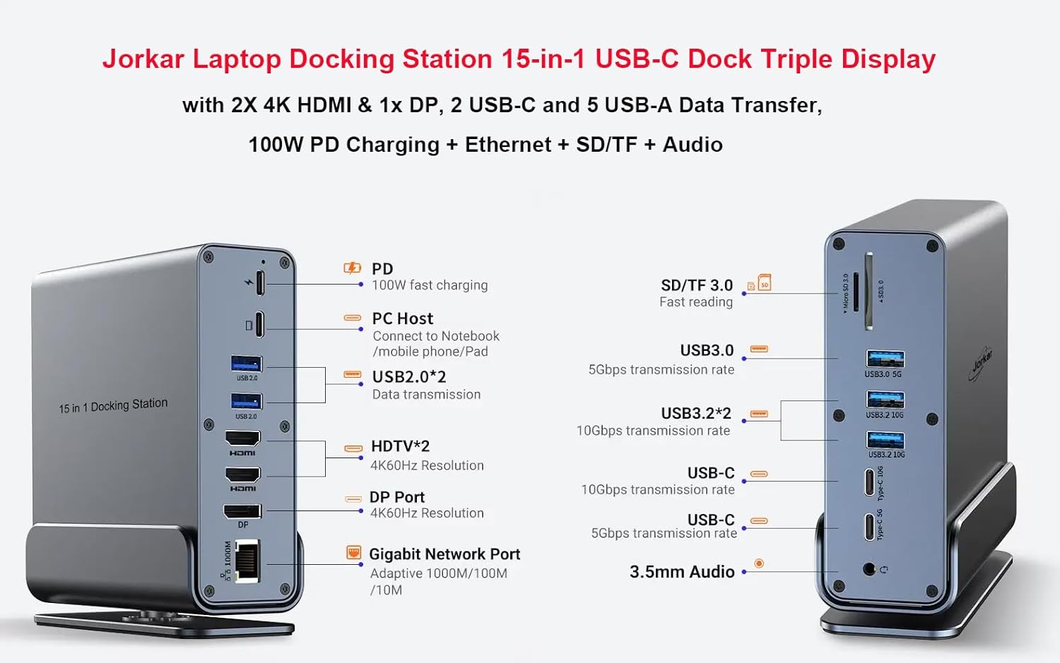 - Huge Expansion: Equipped with an 100W (87W Safety) laptop-charging USB-C PD port, an USB-C PC host, 2x USB-C data port (10Gbps & 5Gbps), 5x USB-A ports(2x USB 3.2 10Gbps, 1xUSB 3.0 5Gbps, 2x USB2.0 480Mbps), 2x 4K HDMI(HDTV) ports, 1x DP Display Port, an Ethernet port, SD/Micro SD TF card slots, a 3.5mm AUX port.