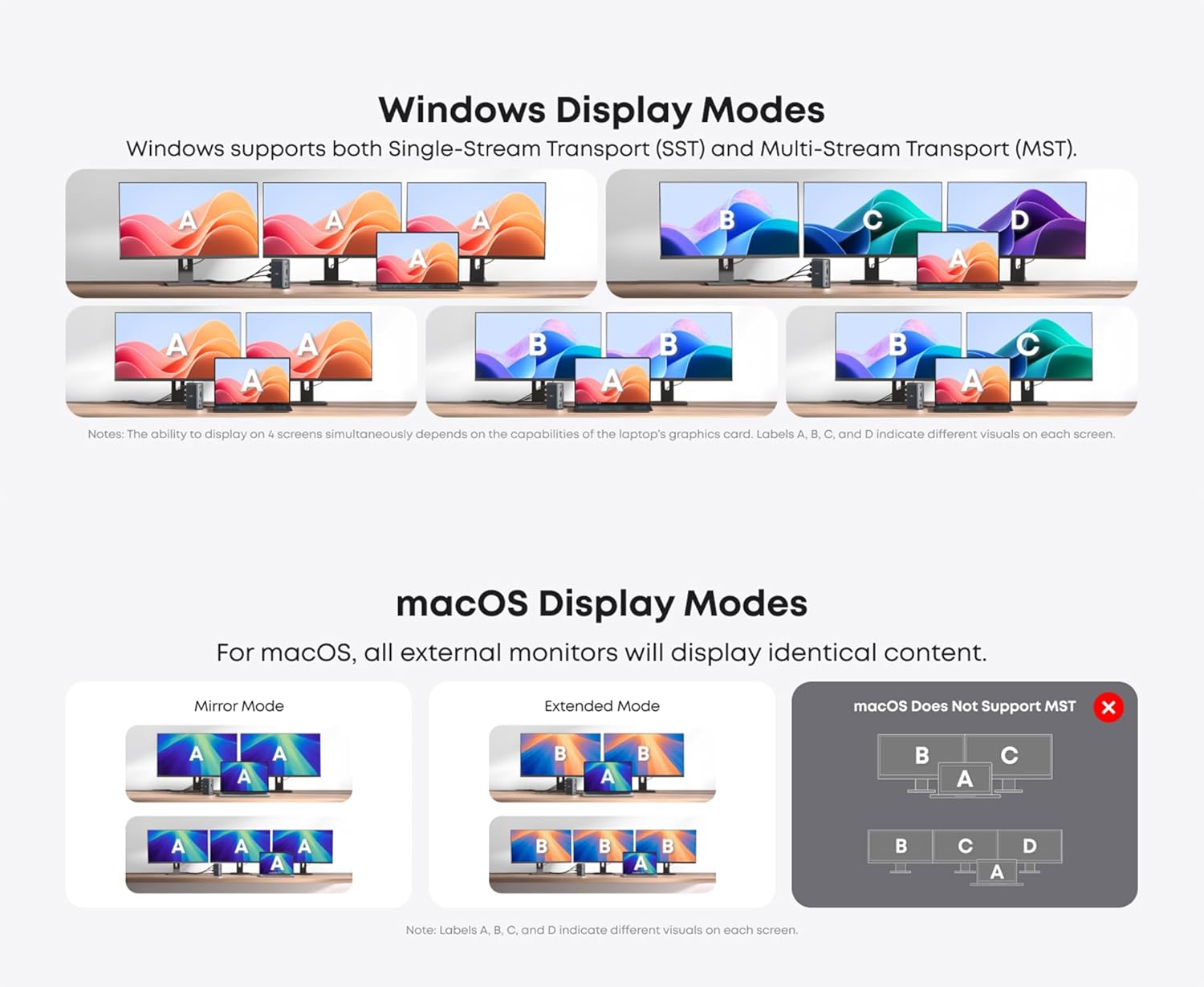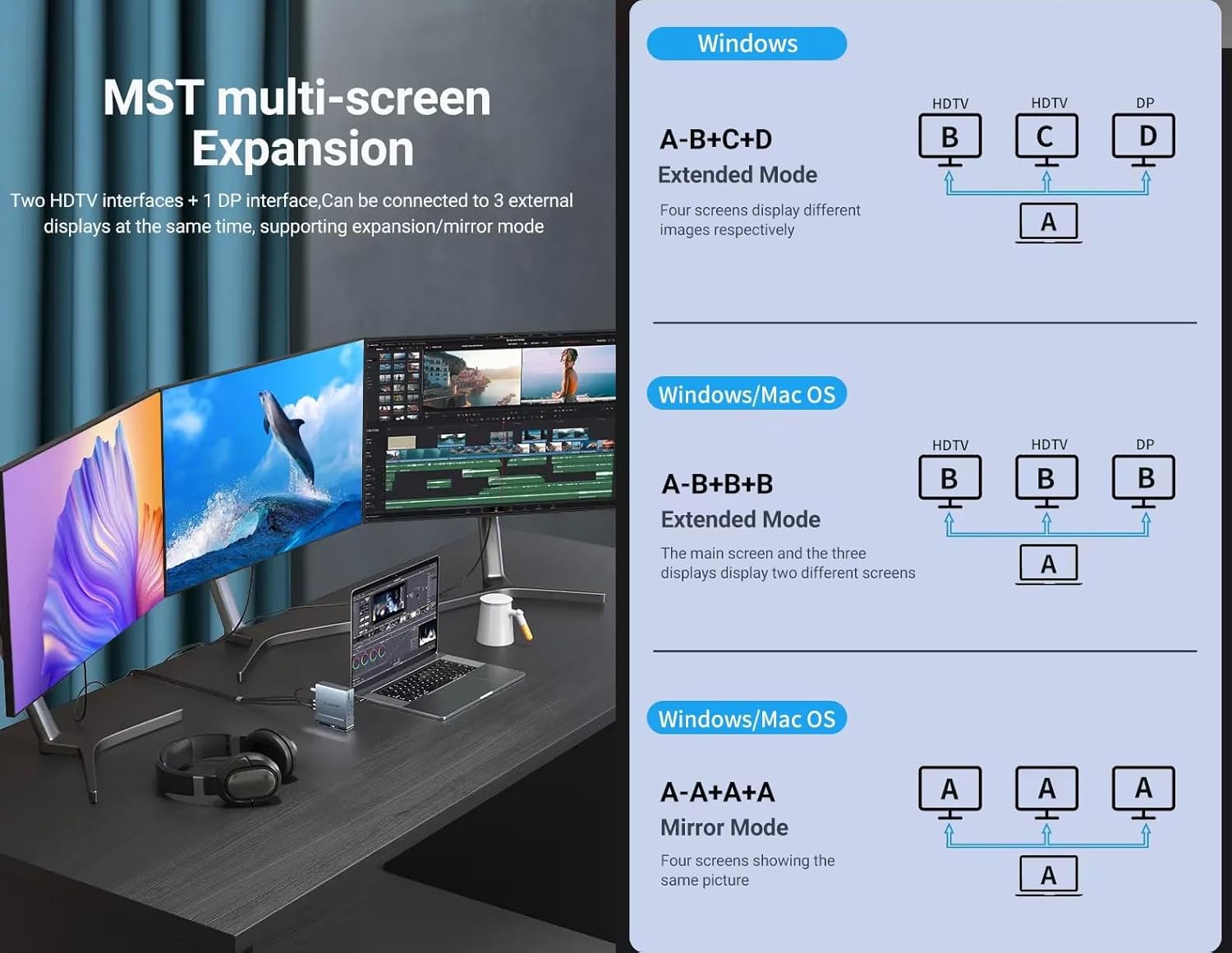 - Compatibility: Supports Thunderbolt, USB-A, USB-C, USB4 connections. Compatible with Windows 10 and 11, Chrome OS, (NOT Linux), Note: For mac OS, it ONLY supports mirror mode, Single-Stream Transport (SST) mode, which means all connected monitors will show the same content.