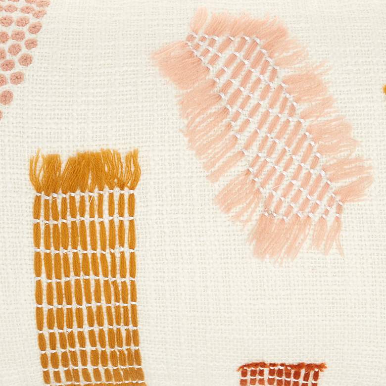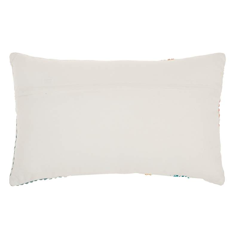 Charming graphical lines and patterns add a whimsical look to a space, thanks to this multi-color rectangular throw pillow by Nourison. This modern decorative pillow presents a solid ivory tone cotton fabric, enhanced by blue, pink and yellow stitched waves and lines, ending in fringe and tassels that give it a textural look and feel. A soft polyester insert offers extra support and comfort, adjusted by a zipper closure on the back.