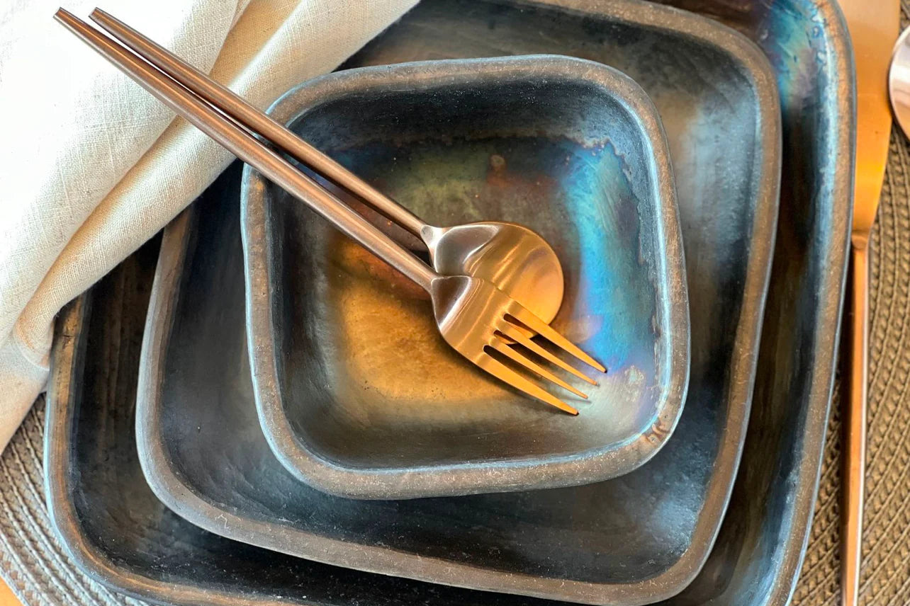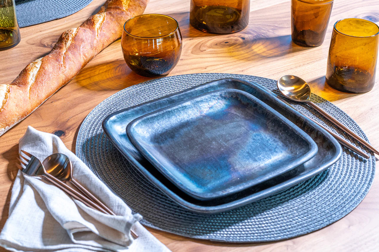 Dishwasher safe on gentle cycle with mild detergent or handwash to preserve the finish. Make sure each piece is dried thoroughly with a soft cloth to prevent water spots and to maintain the unique luster.