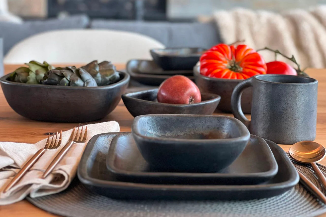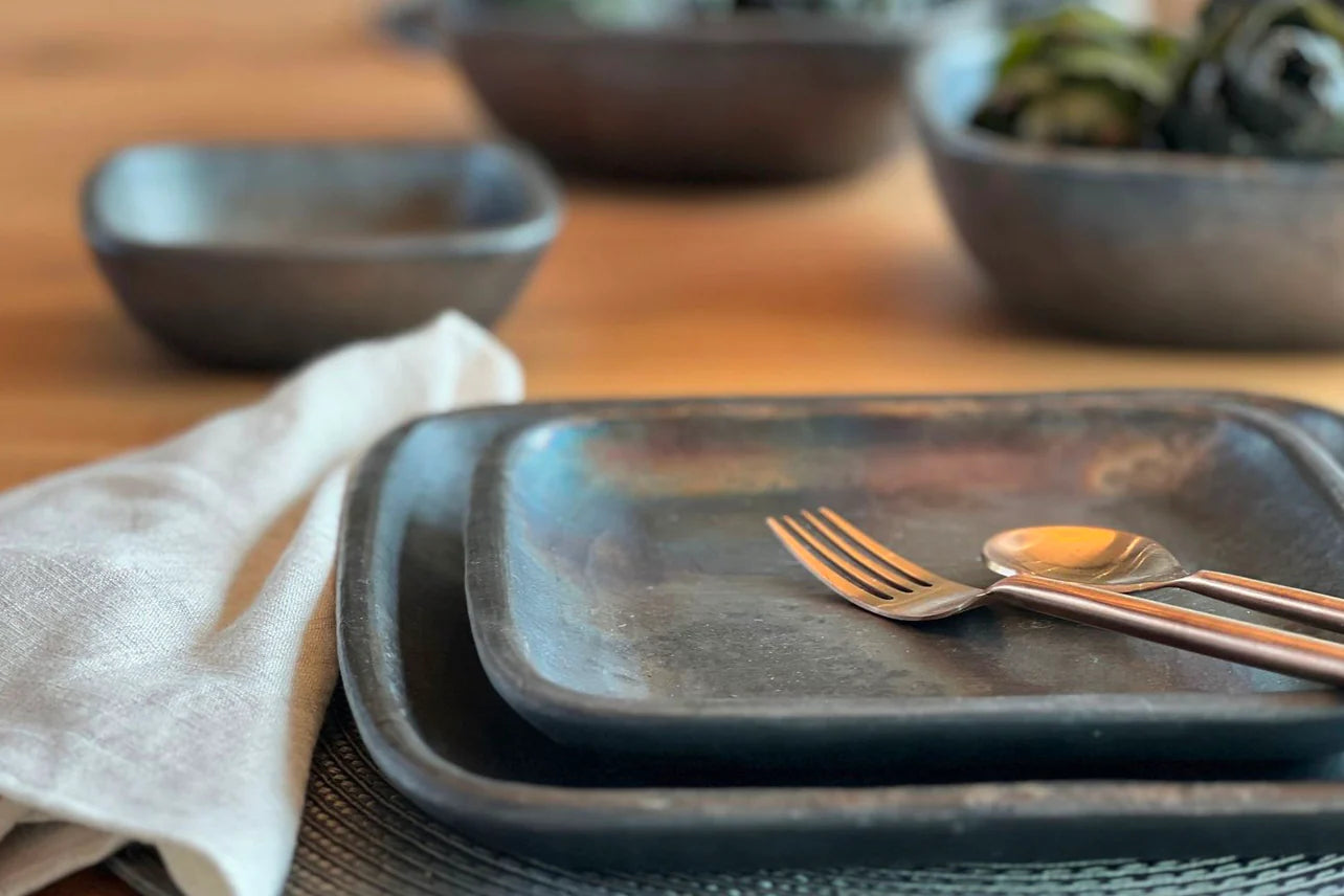 Our Longpi Pottery Dinner Plates are crafted by artisans using age-old techniques in a village in Manipur, India. Each plate is meticulously made without the use of a potter's wheel using locally-sourced weathered-rock and serpentine clay. Each piece is air-dried, then polished with a local leaf and fired to achieve the unique, velvety, matte finish and black hue.