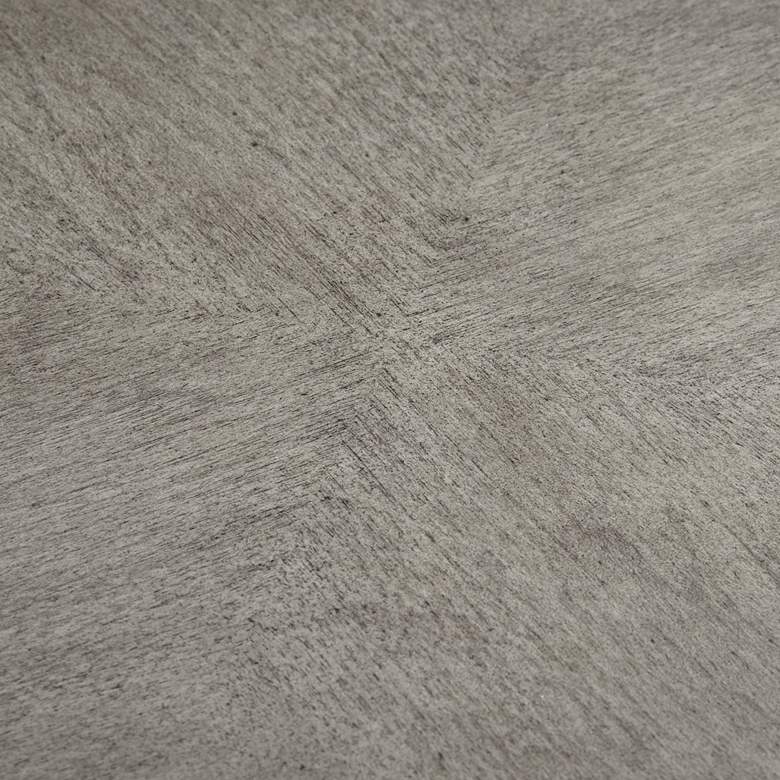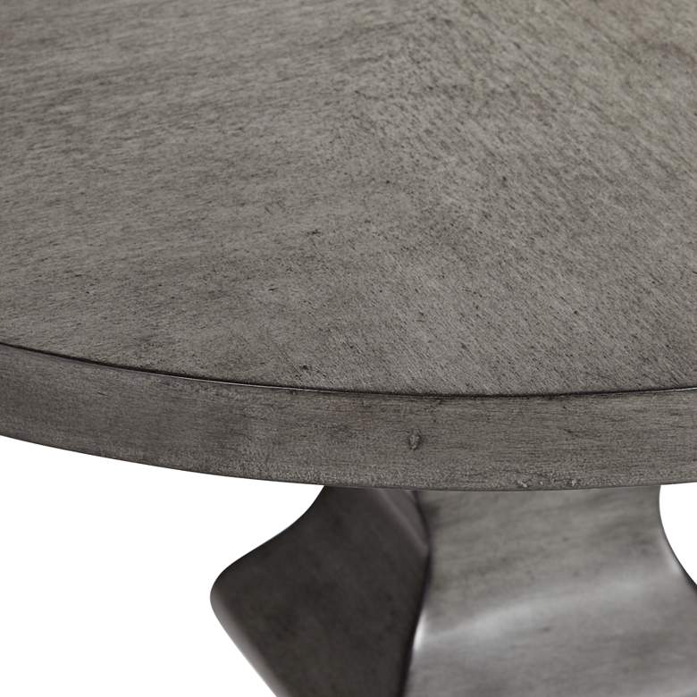 A gray slate finish covers this traditional accent table to provide a neutral, yet bold color that can blend with a variety of color pallets. This accent table features a tiered column with layered squares and a round tabletop. Place this design by your favorite chair or sofa.