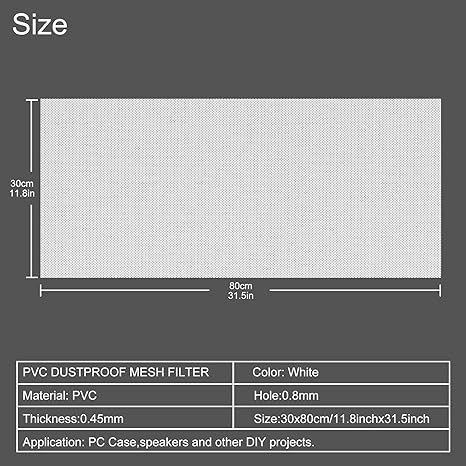 - 0.8mm Fine PC Dust Mesh:High-density PVC filter mesh (0.8mm holes) maintains 30x80cm coverage while allowing maximum airflow. The white magnetic frame fine mesh seamlessly attaches to any pc case dust cover areas without blocking ventilation.