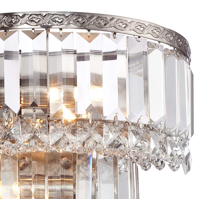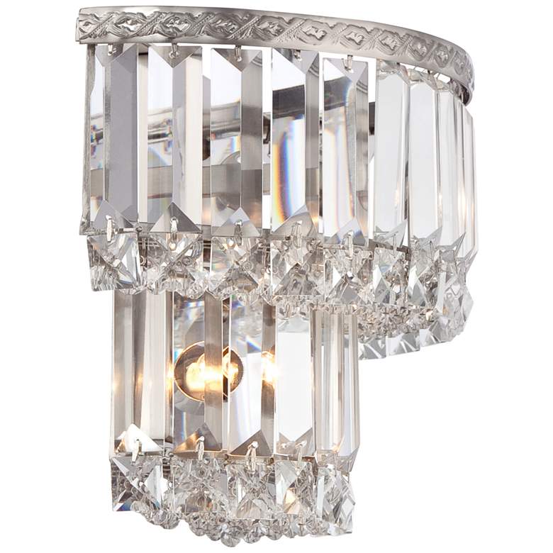 Add timeless elegance to your space with this set of two clear crystal demilune wall sconces and their sparkling shade made from prisms and faceted squares. A band of soothing satin nickel finish metal adorns the top of the tiered, upside down cake-inspired design. This mesmerizing accent brightens your home with two bulbs.