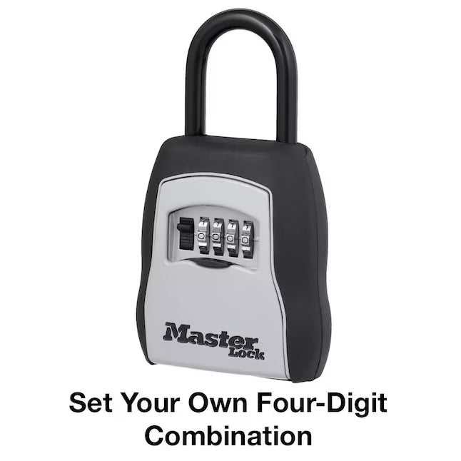 The Master Lock no. 5400DHC portable lock box features a 3-1/4 in. (83 mm) wide metal body for durability. The portable design offers removable over the knob installation. Set your own 4-digit combination for keyless convenience and increased security. The shutter door protects combination dials from weather, dirt and grime; and molded body and vinyl coated shackle prevent scratching. The limited lifetime warranty provides peace of mind from a brand you can trust.