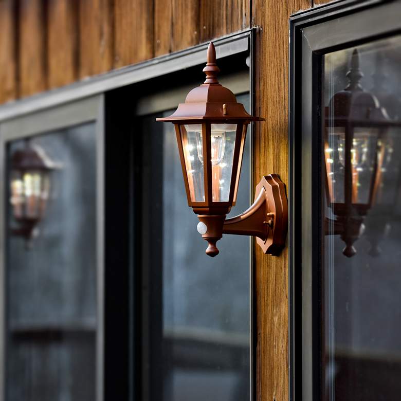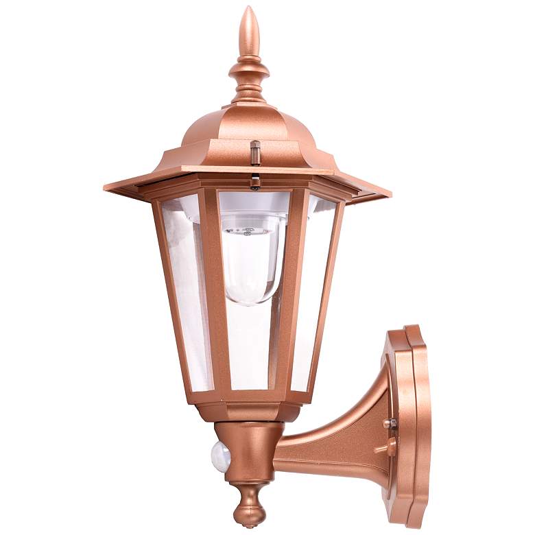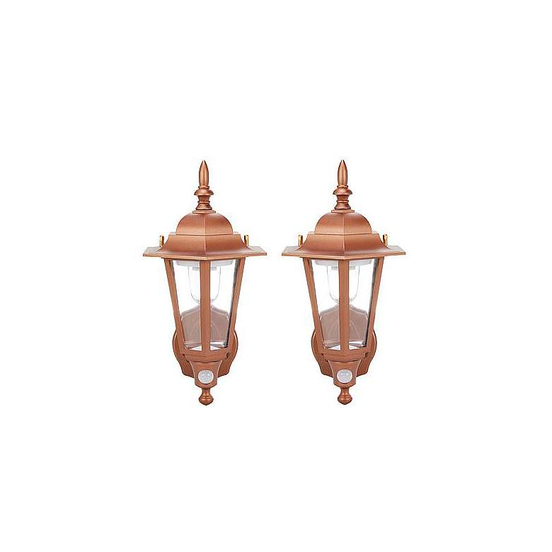 Functional and stylish, this set of two energy-efficient LED outdoor wall lights are perfect flanking a doorway. From Maxsa, the set features a copper finish with glass panels for crisp style and elegance in any setting. These lights motion activated and battery powered, perfect for an entryway. Batteries not included.