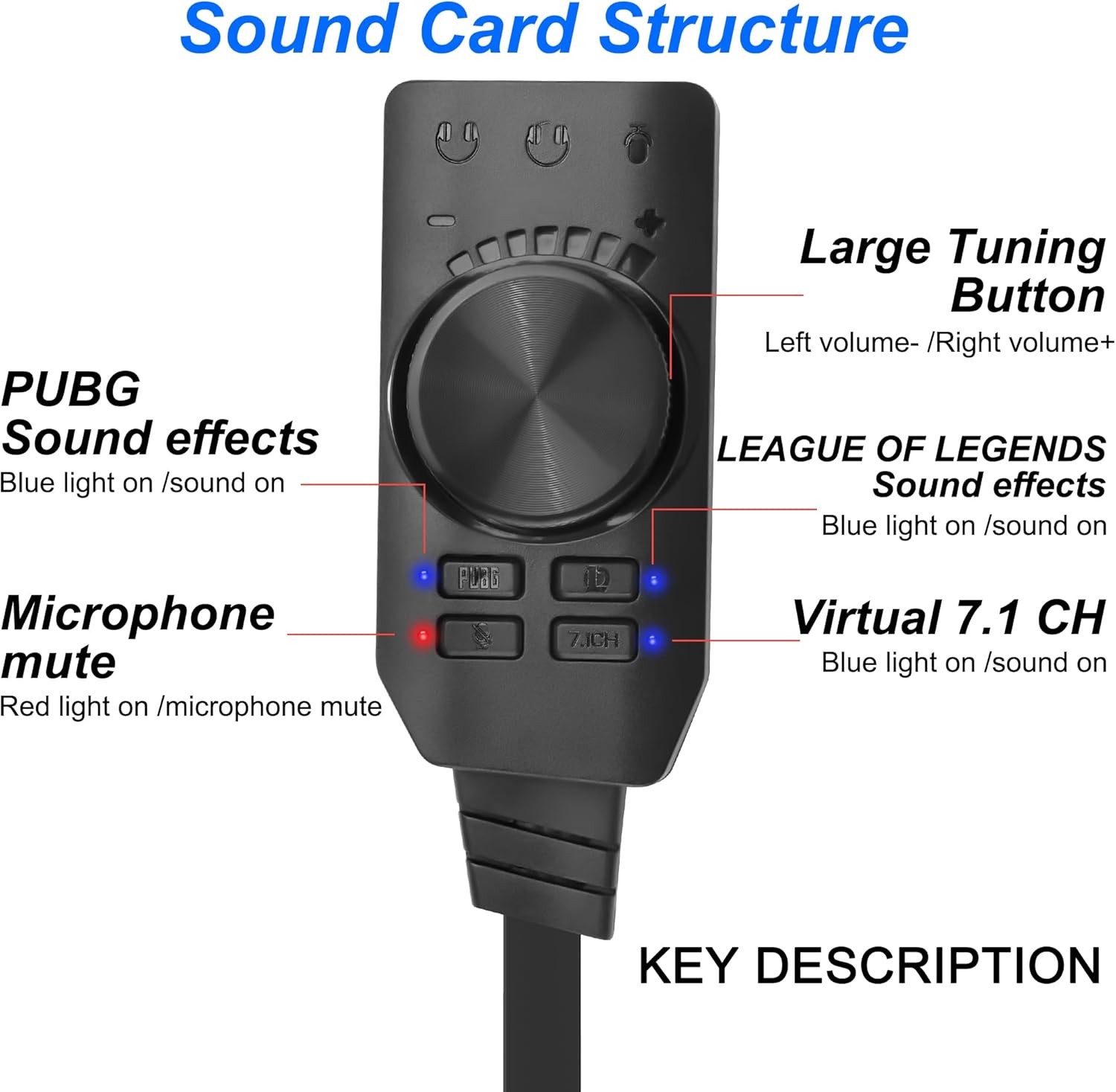 - Sound Card Structure: Interfaces includes USB, 3.5mm jack (4-pole) and 3.5mm double jack (3-pole) - headphone jack and microphone input jack. Functional Keys: Functional keys includes microphone-mute, 7.1 Channel ON/OFF and -up/down roller, sound effect buttons for 2 popular games, easy to use.