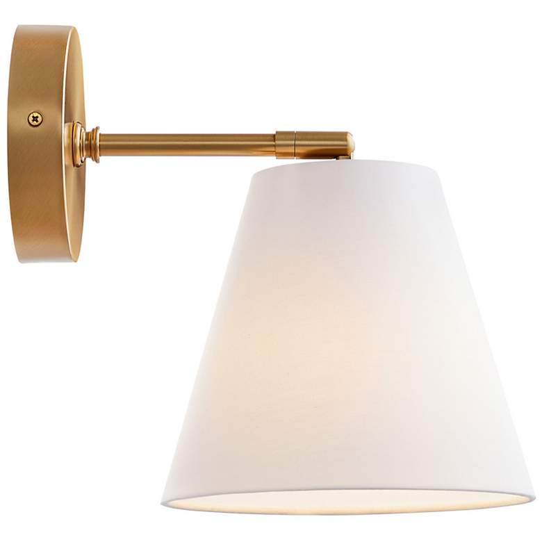 The functionality and fashion of a sophisticated light takes on versatility times two as this set of two modern adjustable wall sconces reflect minimalism in a sleek way. These fixtures from the Meridian collection by Savoy House reflect timeless design personality, nautical and studio-inspired all in one. An adjustable white fabric shade allows movement in each light, useful for reading and highlighting. Warm natural brass finish metal framing offers a lush look. Place this pair on either side of a bed,