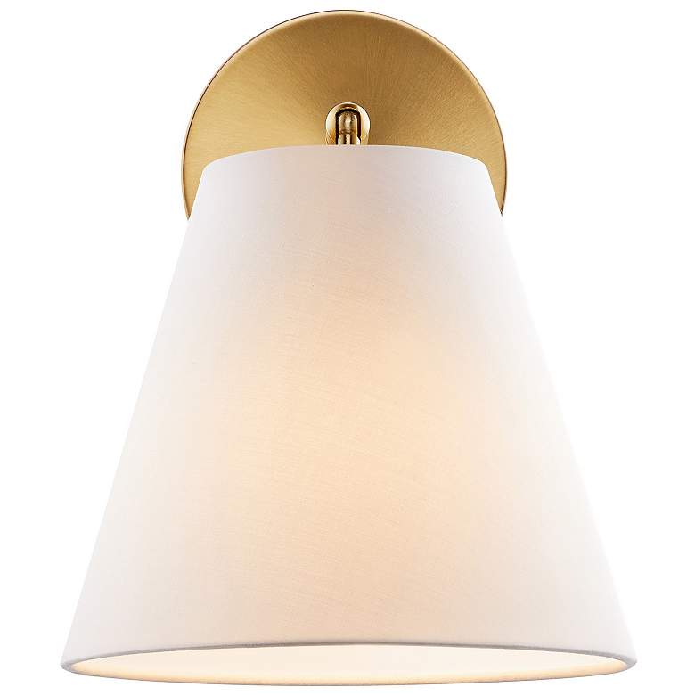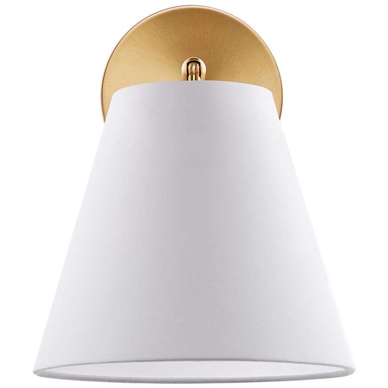 - Natural brass finish over metal frame. White fabric shade.