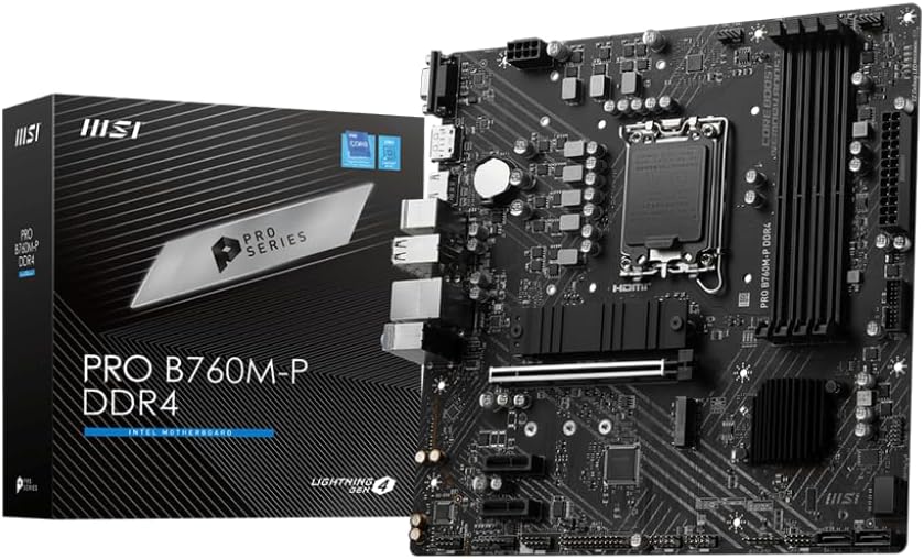 - MSI PRO B760M-P DDR4 micro ATX motherboard supports 12th/13th Gen Intel Core processors for LGA 1700 socket, supports DDR4 Memory, Dual Channel DDR4 4800+MHz (OC), PCIe 4.0, Lightning Gen4 x4 M.2 with M.2 Shield Frozr