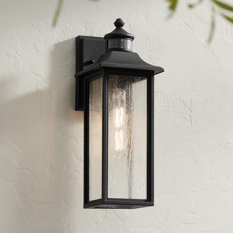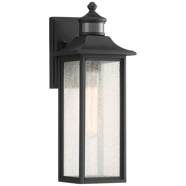Inspired by traditional Mission-style lighting, this outdoor wall light is a handsome addition to your porch or patio. It features a classic black finish and seedy glass panels that create a beautiful rain-washed effect. With a built-in dusk-to-dawn motion sensor, this wall light will add an extra sense of security to your home. Dual-bright design means the light turns on at 25% brightness and goes to 100% when motion is detected. Two minutes after motion is no longer detected, the light will revert to low-level brightness.