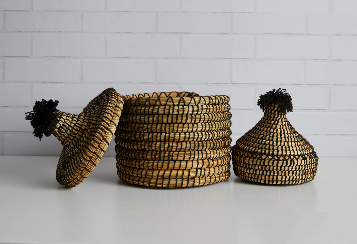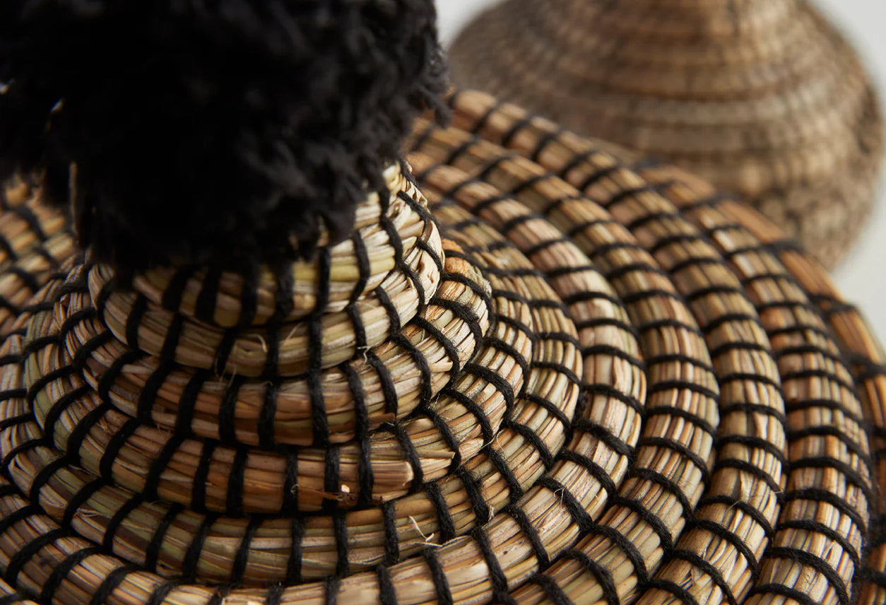 Our baskets are ethically sourced and handwoven and sewn by artisans in Marrakesh. The baskets are woven in different areas but decorated by women in their homes while they look after their children. There are many colors used depending on what is available and sometimes the women add tufts or embroidery to the lids.