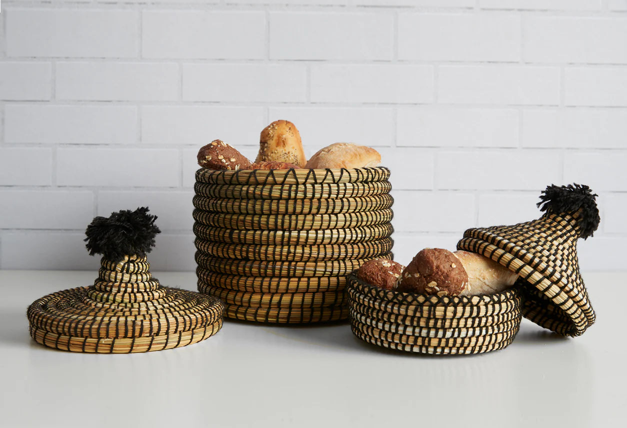 Our Moroccan Bread Baskets are typical designs originating in the Sahara Desert and created by Berbers. They are made with hand-woven palm leaves and decorated with wool using sustainable dyes. These baskets are traditionally used to store bread, fruits, and utensils as they keep things fresh in the kitchen but can also be a great hiding spots for treasures around the house.