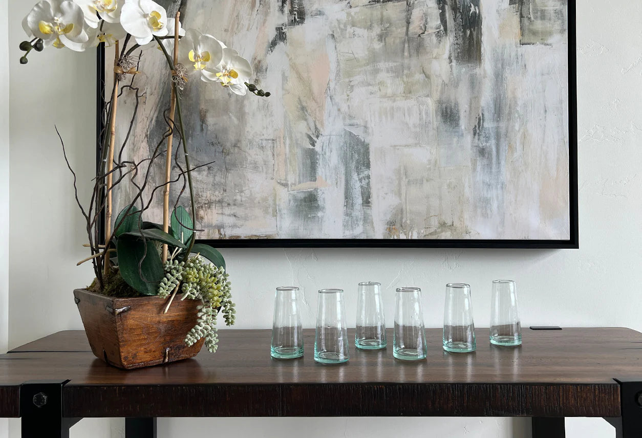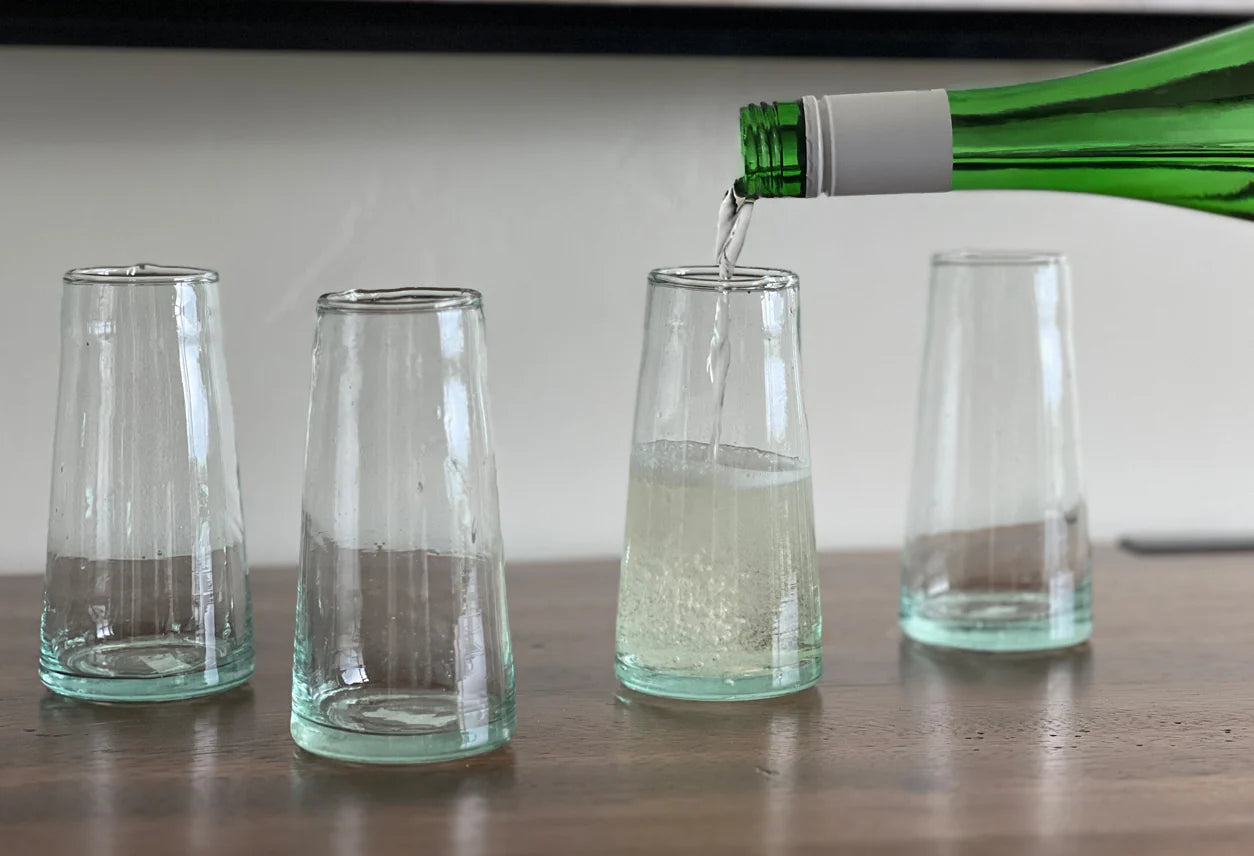Made from recycled wine bottles, these clear sets are a second act for glass that would otherwise be sent to landfills.