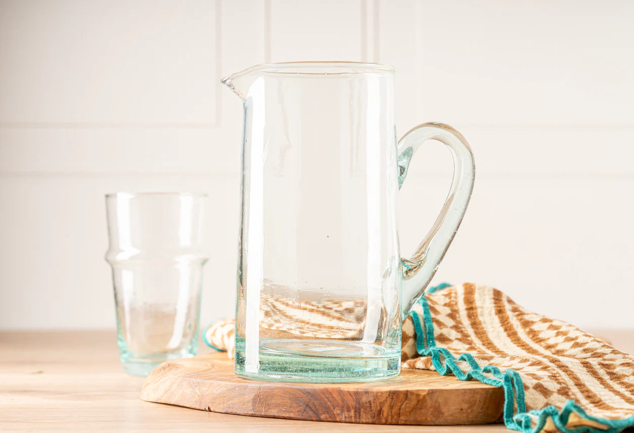 Our Moroccan glassware jugs come in four distinct shades of transparent glass (Clear, Amber, Blue & Green). The handblown construction is evident in the bubbles suspended in the glass itself, and the organic forms that the vessels take. We have also included the Beldi Pitcher which is a perfect match with the Cone Glassware.
