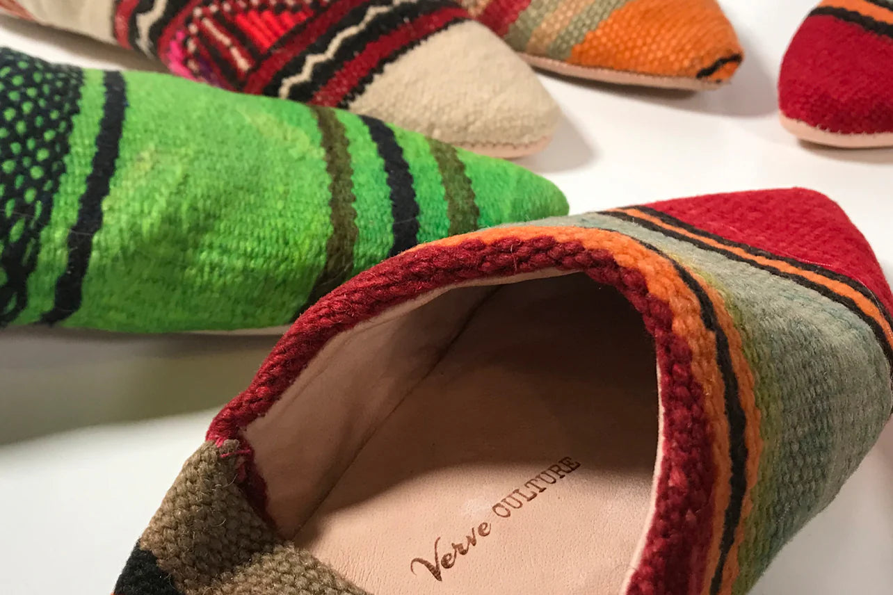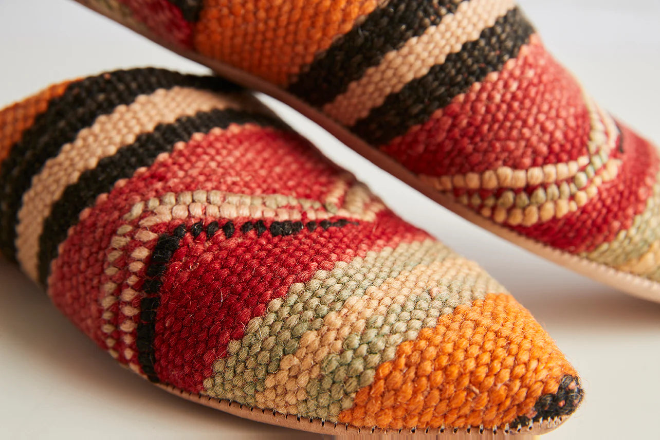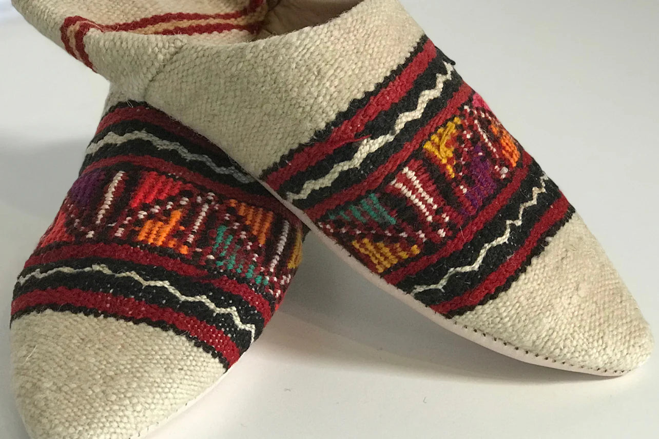 Like snowflakes or fingerprints, no two pairs of our Kilim House Slippers are alike. Each pair will be varied in color and pattern. These slippers are a fusion of artisanal craftsmanship and cozy comfort that transports you to the captivating streets of Morocco with every step.