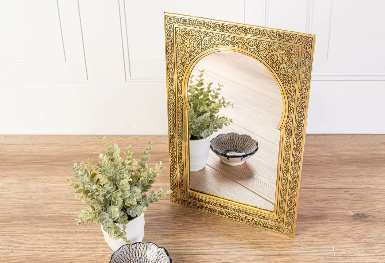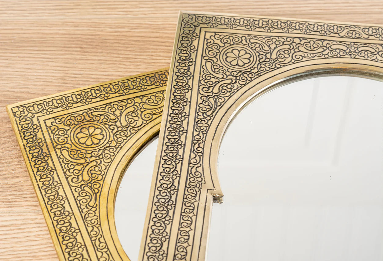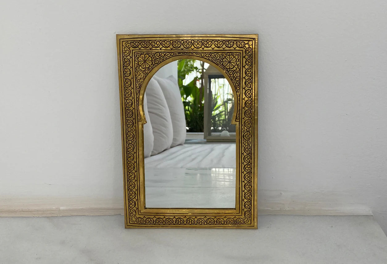 Look deep into these traditionally hand-crafted Moroccan Mirrors. These brass mirrors are a captivating blend of traditional Moroccan craftsmanship and timeless elegance,available in either framed gold or silver. The frames are hand-embossed by craftsmen in Morocco. Perfect for adding stunning decor to your stairs, bedroom, bathroom, entryway, or office.