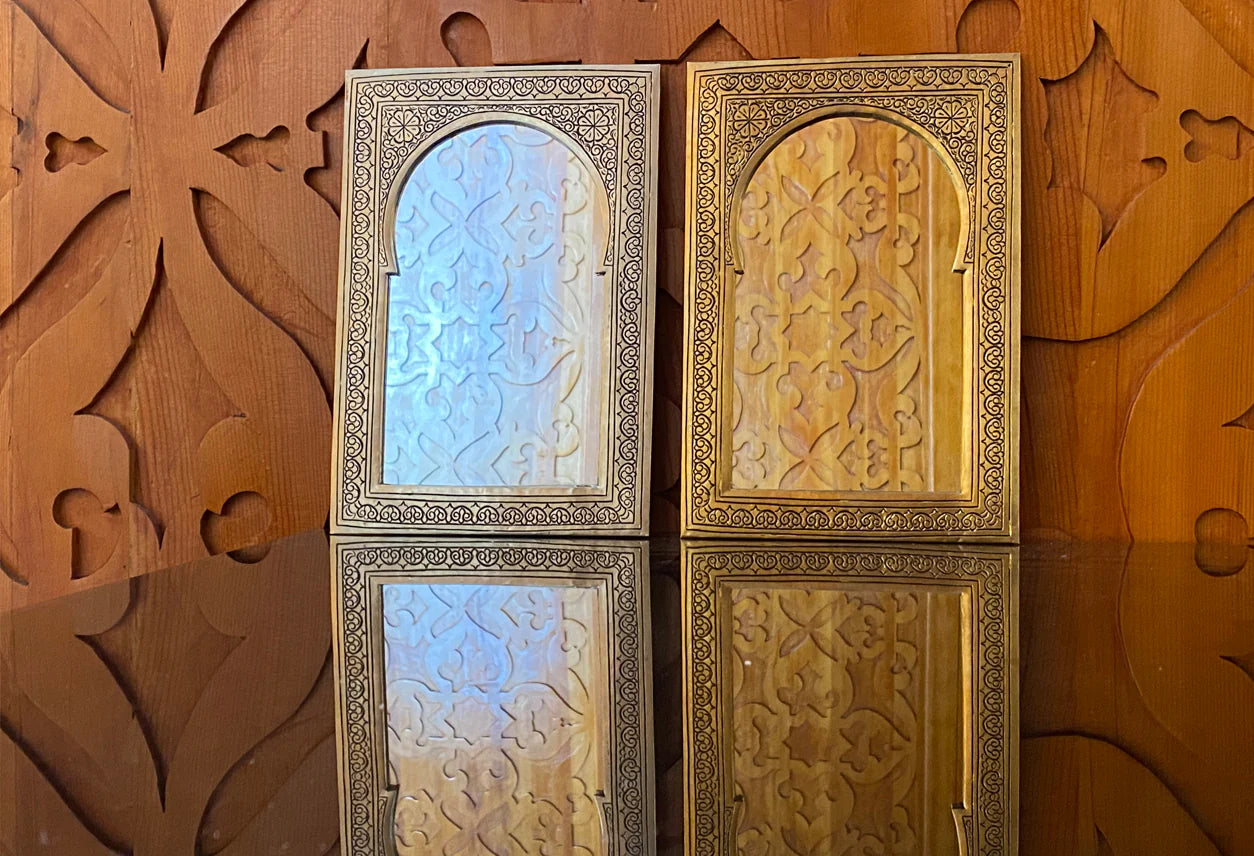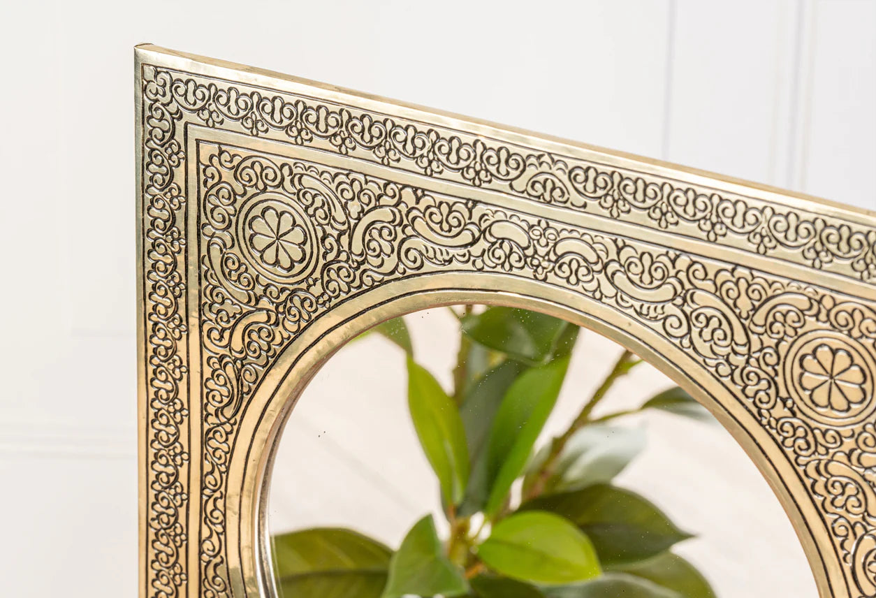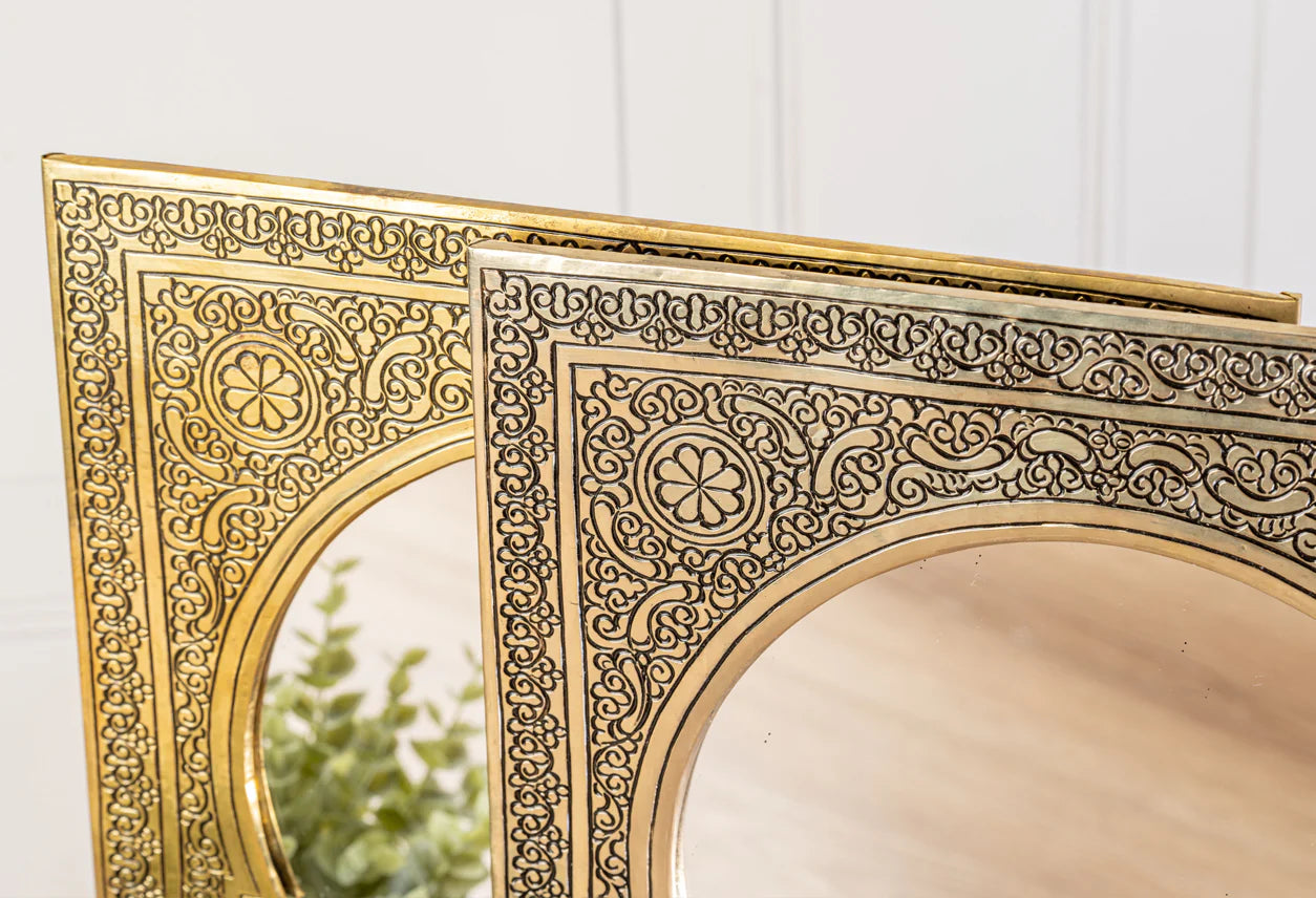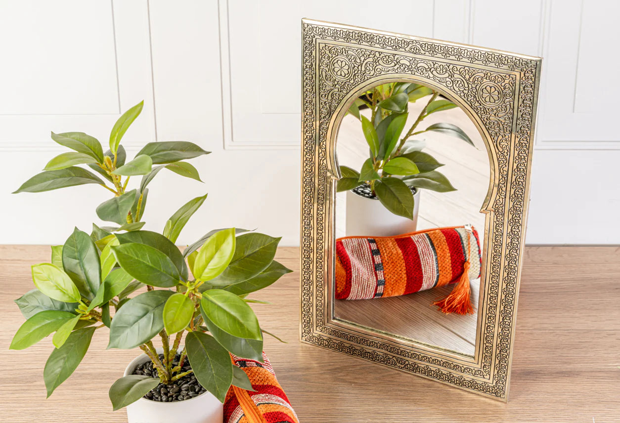 Look deep into these traditionally hand-crafted Moroccan Mirrors. These brass mirrors are a captivating blend of traditional Moroccan craftsmanship and timeless elegance,available in either framed gold or silver. The frames are hand-embossed by craftsmen in Morocco. Perfect for adding stunning decor to your stairs, bedroom, bathroom, entryway, or office.