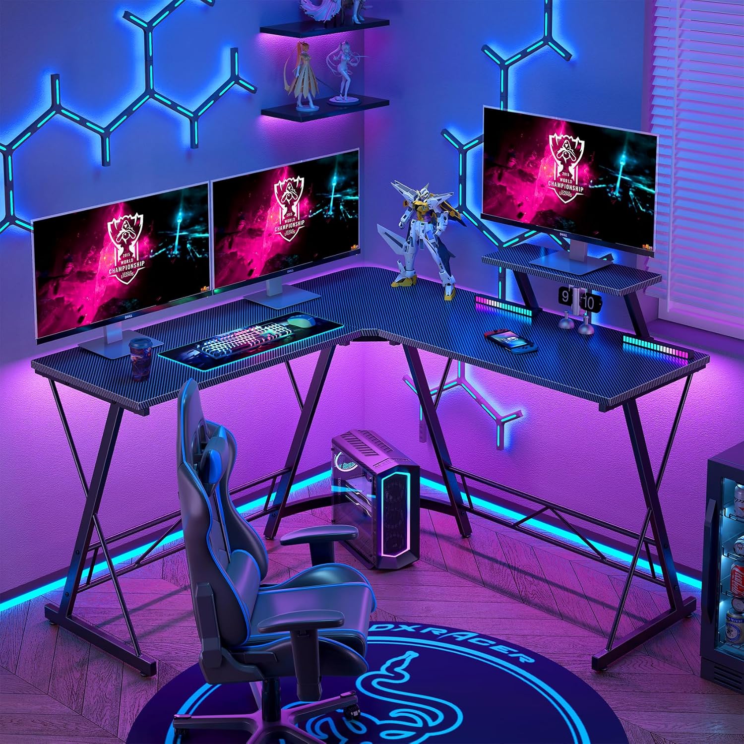 - [Spacious Carbon Fiber Desktop]: Our L-shaped desk has a carbon fiber surface designed with an e-sports theme. The double desktop has 50.8" L * 18.2" W that makes your conversions around the computer desk L shaped easy and your work more fun.